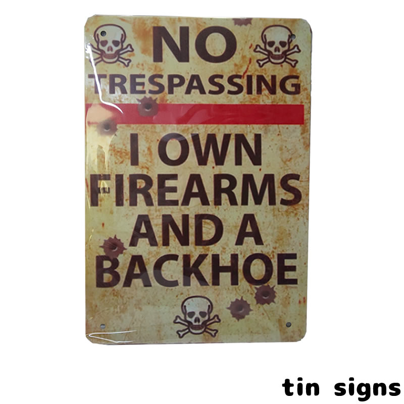 NO TRESPASSING I OWN FIREARMS AND A BACKHOE アメリカン 雑貨 ブリキ看板 メタルサイン ティンサインズ サインプレート tin2-40
