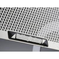 長年のレースシーンからのフィードバックにより完成されたステンレスハニカムメッシュコアガード。材質にはSUS304を#400研磨した、錆にくさとねばり強さを兼ね備えた高級ステンレスを採用。従来の板厚(0.5t)から、さらに重量感のある板厚(0.8t)へグレードUPしました!ラジエターの熱交換性を妨げずフロントタイヤの巻き上げる小石やゴミ、ライトめがけて飛んでくる昆虫、またサーキットにおいては路面に落ちているタイヤカスやフロントタイヤからスピンオフされた細かいゴムの破片をタイヤ幅に合わせた中央部の細かいメッシュが確実にガード。両サイドの粗いメッシュは冷却効率とプロテクトという相反するテーマの両立を考慮され極限にまで広げられた開口率になっています。アルミやチタンの場合、厚みを増すことによりメッシュライン幅も太くせざるを得ないところ、このSUS304は従来(0.5t)のライン幅を保持しながらも強度も大幅に向上させることを可能にしました。これは、過酷なストリートユースにおいても長期にわたる耐久性を考慮したもので、あらゆる材料から走行テストを重ね吟味致しました。何より大切な事は新車時のコア形状をいつまでも保つこと。あなたの愛車のドレスアップと性能を維持する為のアイテムとして是非、装着をお勧めします。