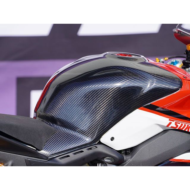メス型とオス型でプレスして成型するので、裏側がゲルコート面となり、ツルツルの状態でタンクとの密着性が非常に高く、またタンク自体へのダメージもほとんどありません。他社のタンクカバーやタンクバッドの多くが裏側がFRPやカーボンの材料むき出しのままでタンクに傷がついてしまう事がありますが、コールドプレス製法だと傷がほとんどつきません。