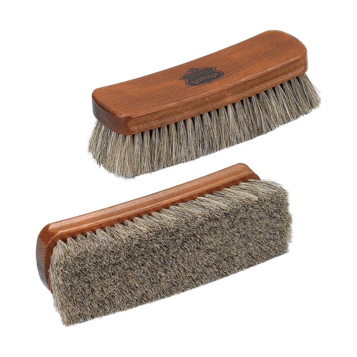 ●ワンポイントアドバイス - 豚毛ブラシと馬毛ブラシの使い分け - ホコリ落としは馬毛ブラシを、クリームを全体に伸ばすのには豚毛ブラシがおすすめです。馬毛ブラシは毛先がしなやかなため、皮革製品の表面やコバ周りのホコリ落とし、 クリーム塗布後の仕上げのツヤ出しに最適です。