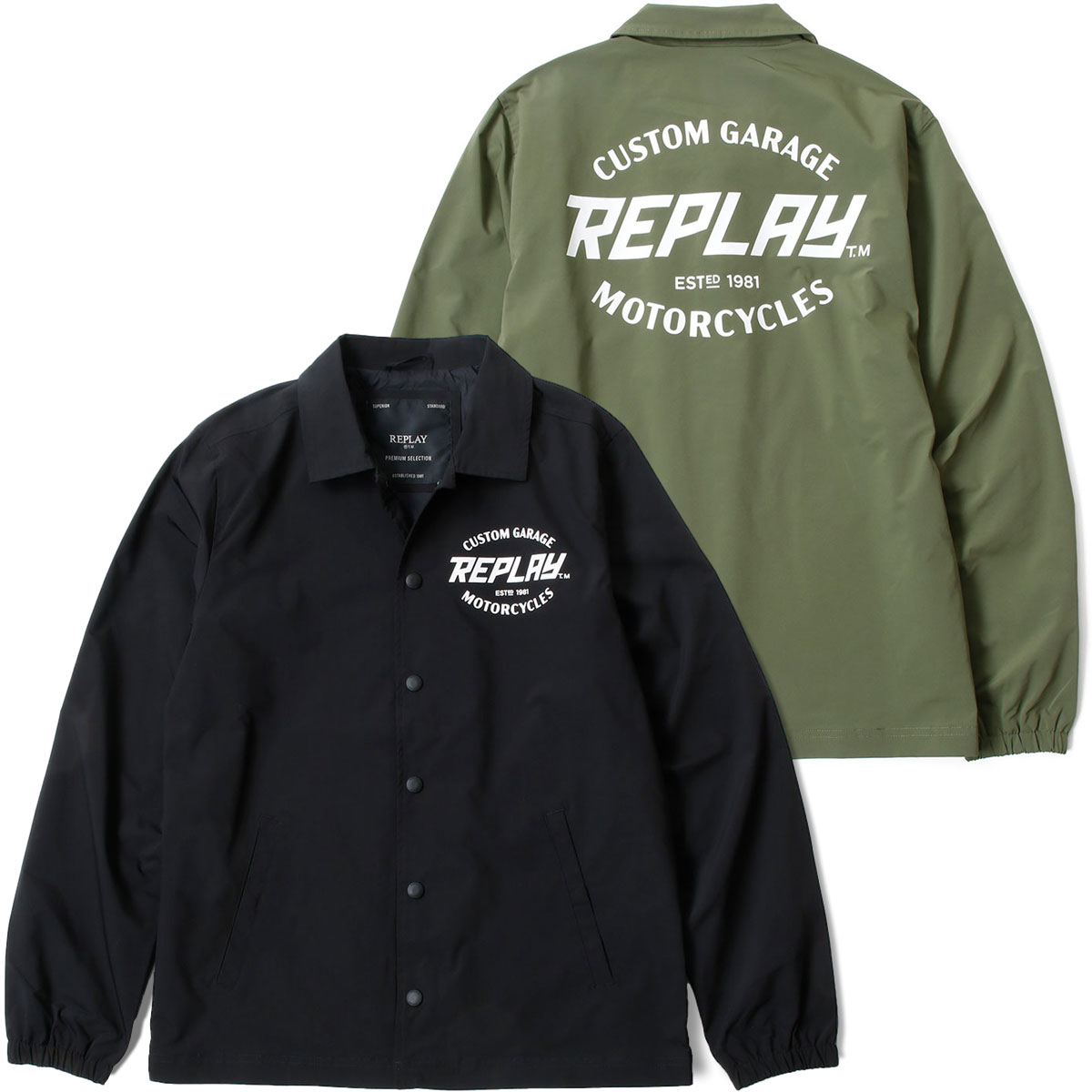 | リプレイモーターサイクルシリーズのコーチジャケット。 胸元と背面に施されたカスタムガレージプリントのデザインが特徴的です。ラフに羽織ので様々なスタイルに合わせやすいアイテムです。