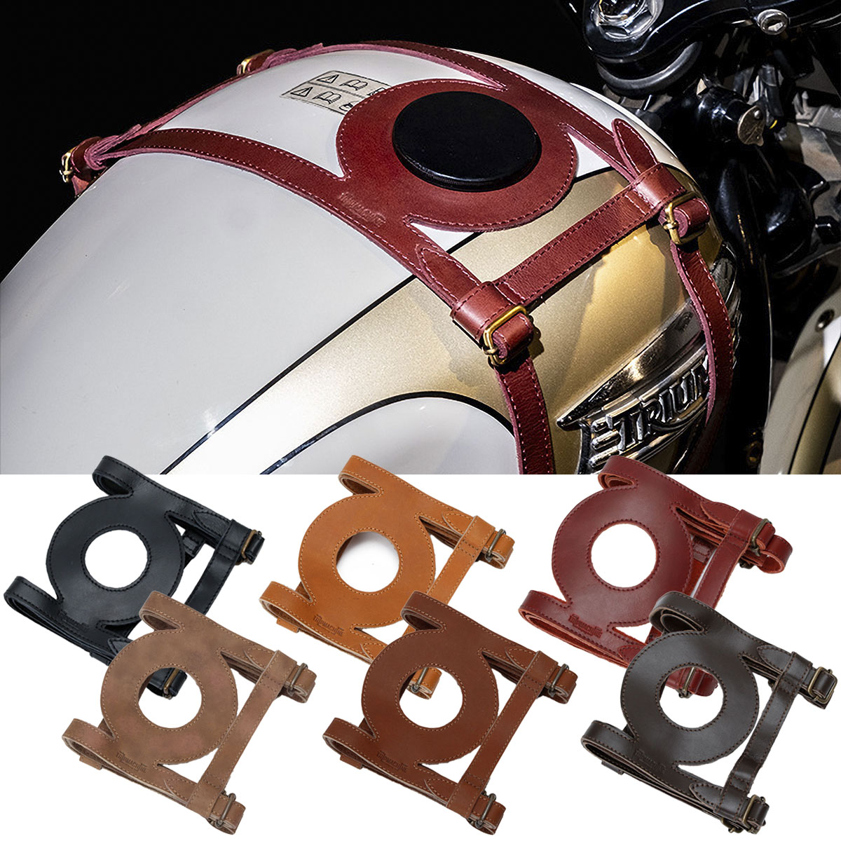 取り付けの心配はいりません 水平の取り付け金具を採用しているため、専用に設計されたかのようにあらゆるバイクにぴったりフィットします。 ストラップでベストな位置に調整可能 両サイドの調節可能なストラップで、タンクへのフィット感を自由に調整できます。まるでバイク専用のスタイリストがいるかのよう。 目立たないヒーロー、アルミニウムストリップ このストラップの中には、静かな守護者であるアルミニウムストリップが隠れています。ストラップの形を維持し、平行に保つことで、常に最適な状態をキープします。 まるでバットマンの執事、アルフレッドのように、全てがスマートかつスムーズに機能するように働いています。 給油口の位置は心配無用です 給油口が中央にあろうと、右側(※1)にあろうと、問題ありません! バイクの給油口の位置に合わせてストラップを選べばいいだけです。 入口が円形であることが唯一の条件です。 まるでバイクにぴったりの衣装を選ぶような感覚ですね。 別売のユーティリティポーチでさらに便利 本製品と相性の良い、機能的なユーティリティポーチ(※2)を追加することもできます。 これはただのポーチではありません。 ストラップに取り付けられる相棒のような存在で、必需品を持ち運ぶのにぴったりです。 そして、バイクを降りればベルトポーチに変身! まさにマルチタスクな究極のアイテムです。 仕上げ加工・個体差について こちらの商品は、仕上げ加工の特性上「傷・擦れや皺(シワ)・色ムラ」などがあり、状態には個体差がございますので予めご了承の上ご注文ください。 ※1※2:センターキャップバージョン、ユーティリティポーチは下記よりご確認がいただけます。 > タンク ストラップ(センターキャップ用) > ユーティリティ ポーチ 【サイズ】 本体フレーム:33.5 × 16 cm ストラップの長さ:78 cm 【素材】 本革 【特徴】 - ユニバーサルフィット: 円形の燃料インレットを持つほとんどのバイクに適合します。 - 耐久性のあるレザーと真鍮のアジャスターで、長持ちするように作られています。 【ご注意】 ※入荷時期が記載されているカラー、サイズについてはご予約扱いとなります。商品入荷後に発送いたします。 ※入荷時期は目安となります。大幅に遅れる場合には事前にご連絡をさせていただきます。 ※予告なく商品に軽微な変更が行われる場合がございます。 ※入荷した商品が当店の品質基準に満たない場合、商品のご用意ができかねる場合がございます。その際には商品代金をご返金をさせていただきます。(※クレジット決済の場合) ※通常商品と同時注文はできません。■Trip Machineのアイテムは下のバナーをクリック |