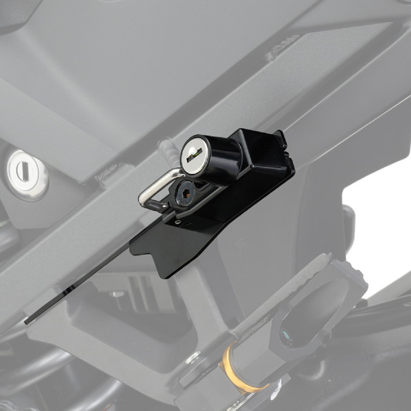 左側タンデムステップホルダーと共締めで簡単装着。カギは2本付属。
