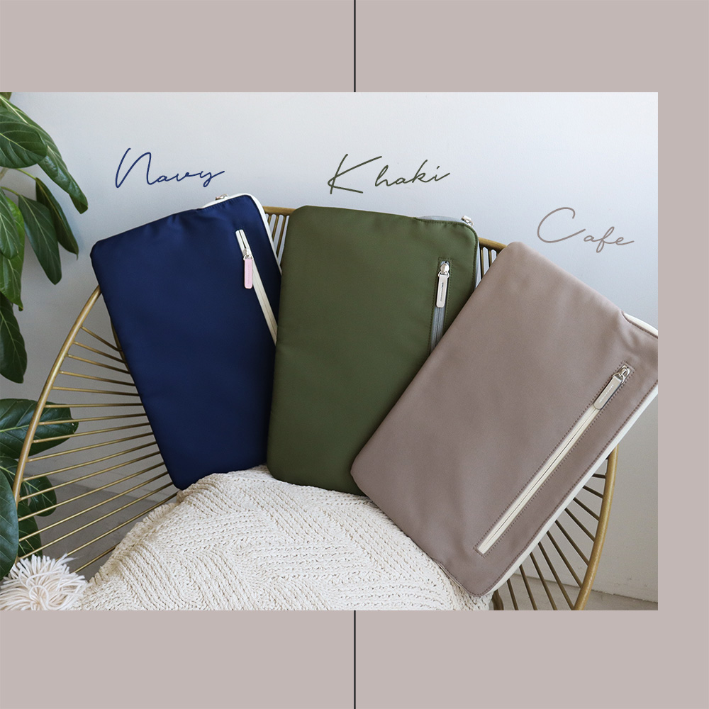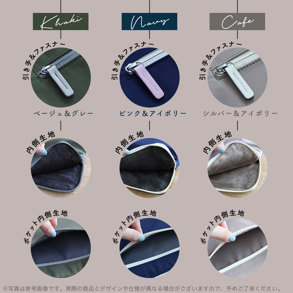 それぞれのケースによって、引き手・ファスナー、内側生地、ポケット内側生地は異なったカラーを使用しています。