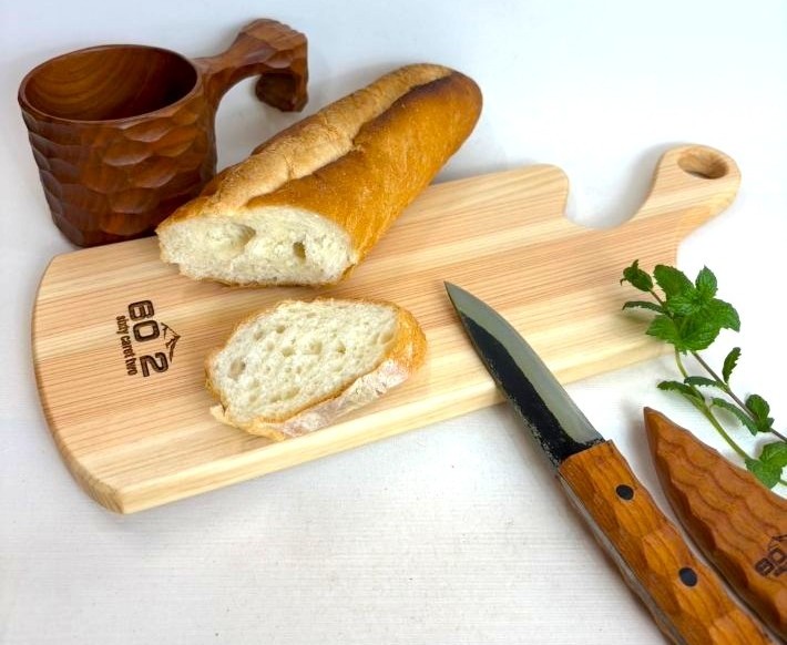 ヒノキ製のカッティングボード サイズ:38×14×厚み1.5cm持ち手の付いた便利でおしゃれなカッティングボード。お料理をのせてそのまま食卓にもOK。アウトドアにも活躍。