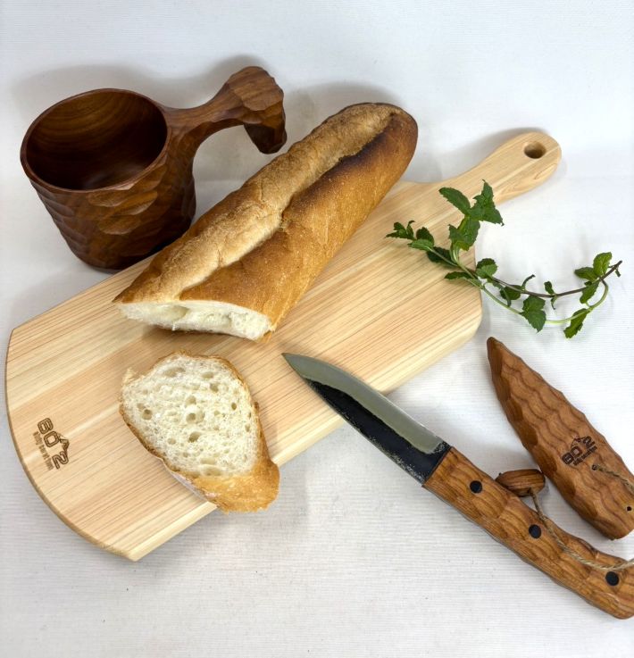 ヒノキ製のカッティングボード サイズ:38×15×厚み1.5cm持ち手の付いた便利でおしゃれなカッティングボード。お料理をのせてそのまま食卓にもOK。アウトドアにも活躍。