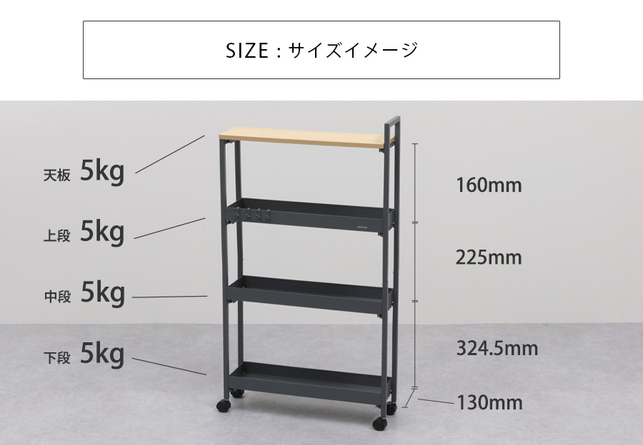 耐荷重(約):20kg (天板:5kg, 上段:5kg, 中段:5kg, 下段:5kg)