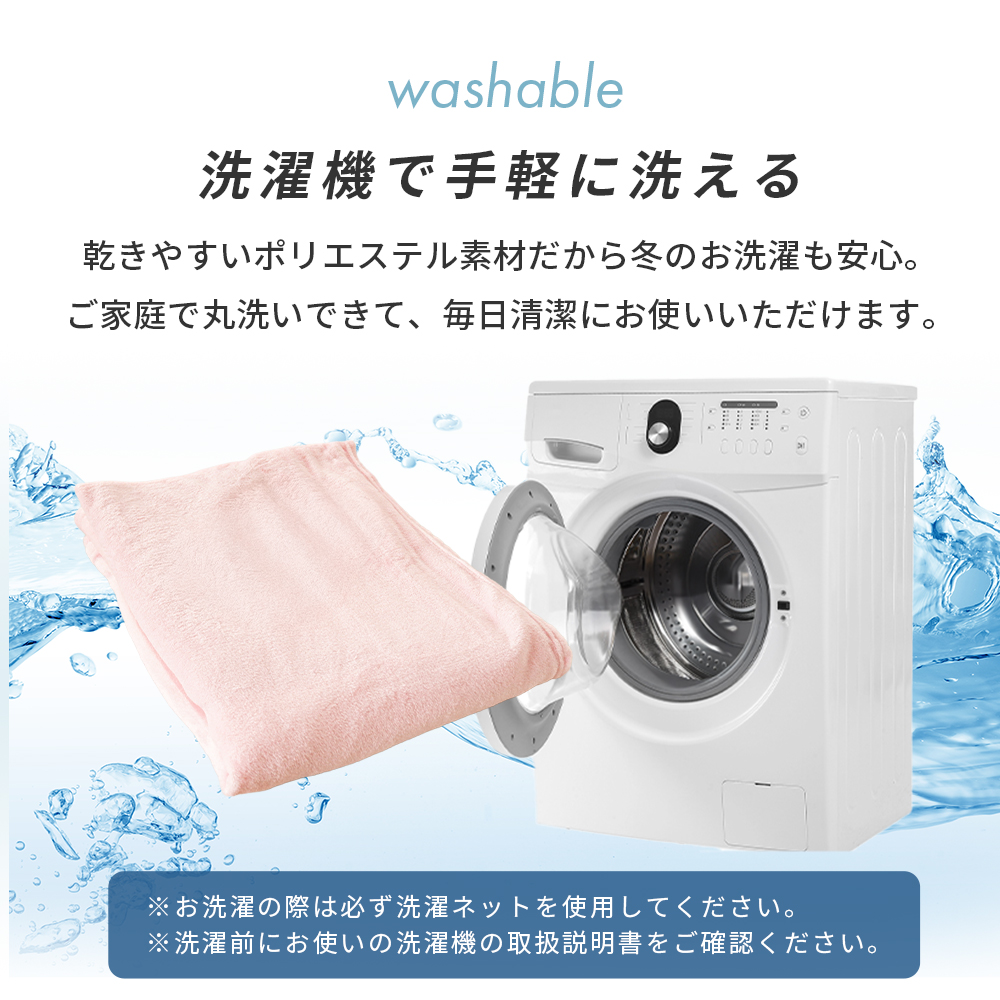 乾きやすいポリエステル素材だから冬のお洗濯も安心。ご家庭で丸洗いできて、毎日清潔にお使いいただけます。