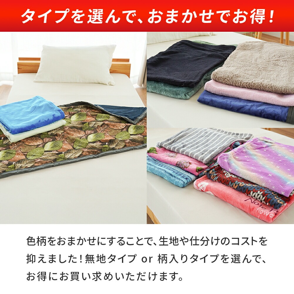 色柄をおまかせにすることで、生地や仕分けのコストを抑えました!無地タイプ or 柄入りタイプを選んで、お得にお買い求めいただけます。