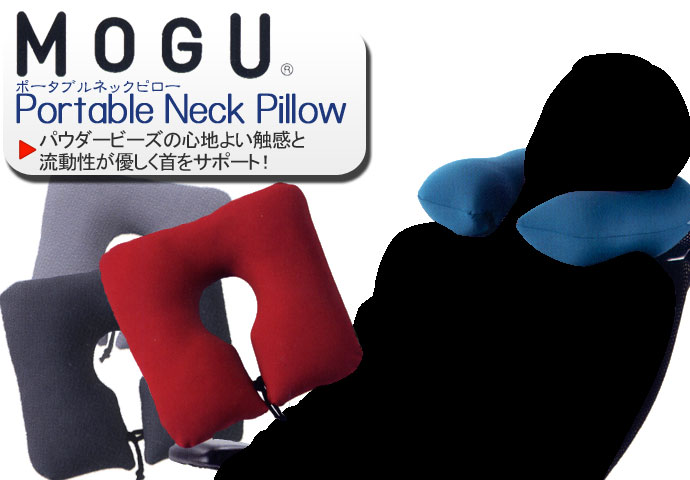 ●安定感が違う!  MOGU ポータブルネックピローの中材には、パウダービーズが入っています。 ビーズ特有の流動性は、ふんわり心地よい感触なのに首をしっかりととらえるので、従来のエアーピローに比べ安定感が違います。車や飛行機での移動、旅行のお供にどうぞ。 |