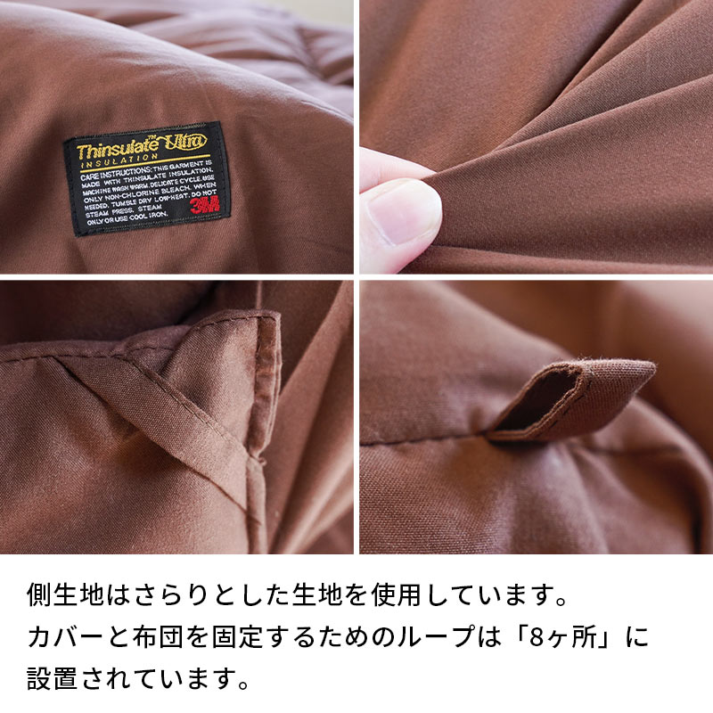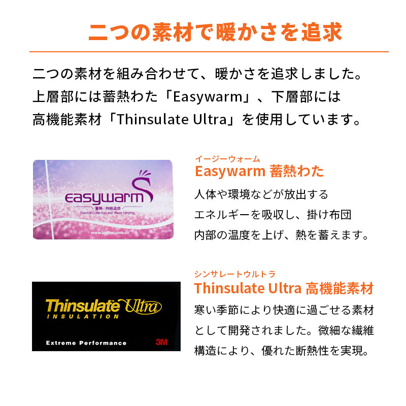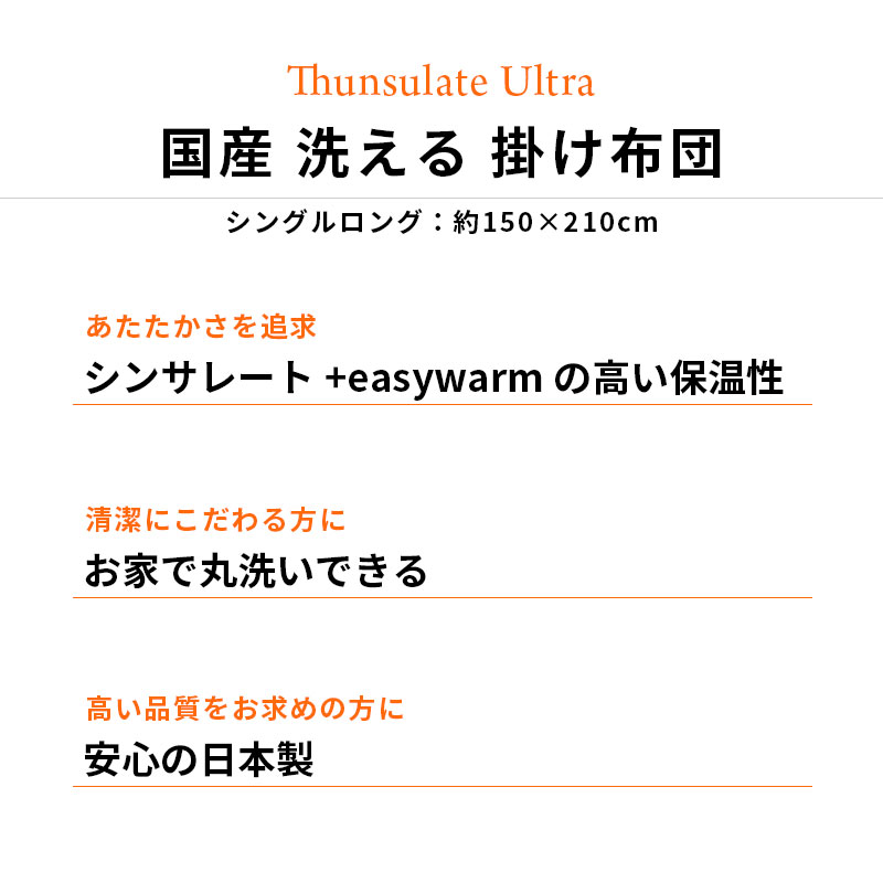 | ・獣毛を使わない、あたたかな掛け布団。 羽毛アレルギーの方や獣毛の独特の臭いが苦手な方、 気軽に扱えるあたたかいお布団をお求めの方。そんな あなたにおすすめなのが、軽くて暖かく、お手入れも しやすいシンサレートの掛け布団です。 ・お家で洗えていつでも清潔羽毛布団とは違い、洗濯機で洗えるのが嬉しいポイント。 小まめに洗って清潔に保ちたい方におすすめです。 ・二つの素材で暖かさを追求二つの素材を組み合わせて、暖かさを追求しました。 上層部には蓄熱わた「Easywarm」、下層部には 高機能素材「Thinsulate Ultra」を使用しています。 | |
