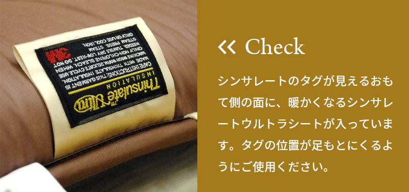 シンサレートのタグが見える表側の面に、暖かくなるシンサレートウルトラシートが入っています。
