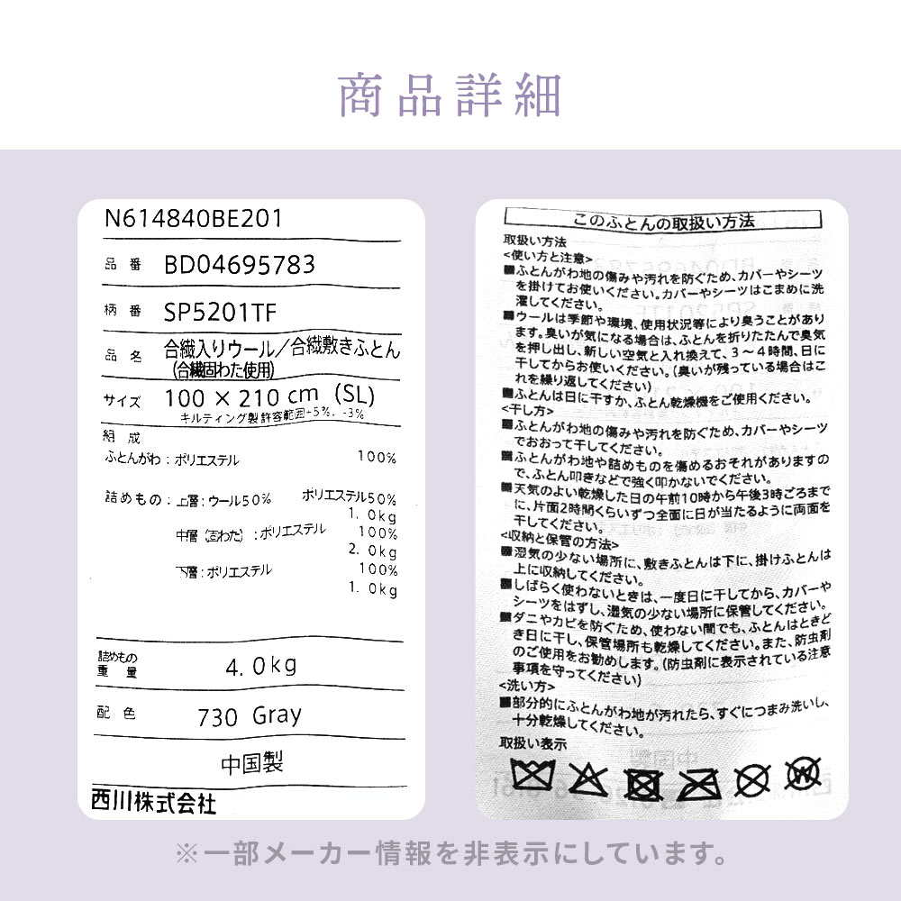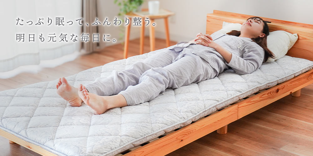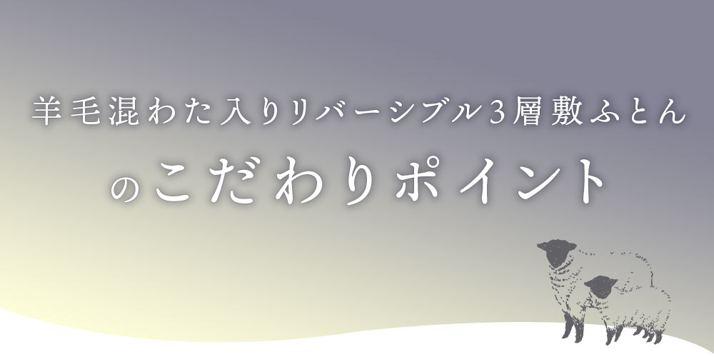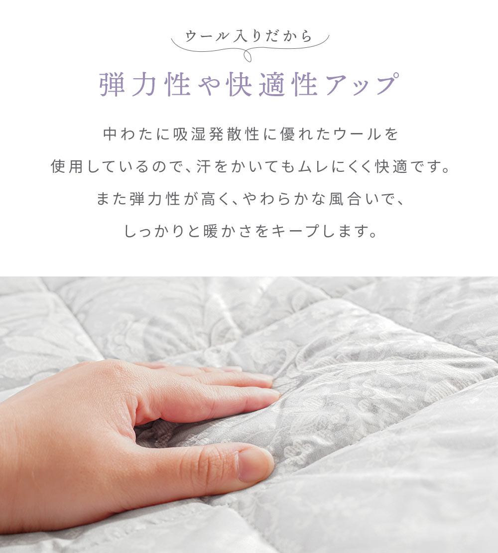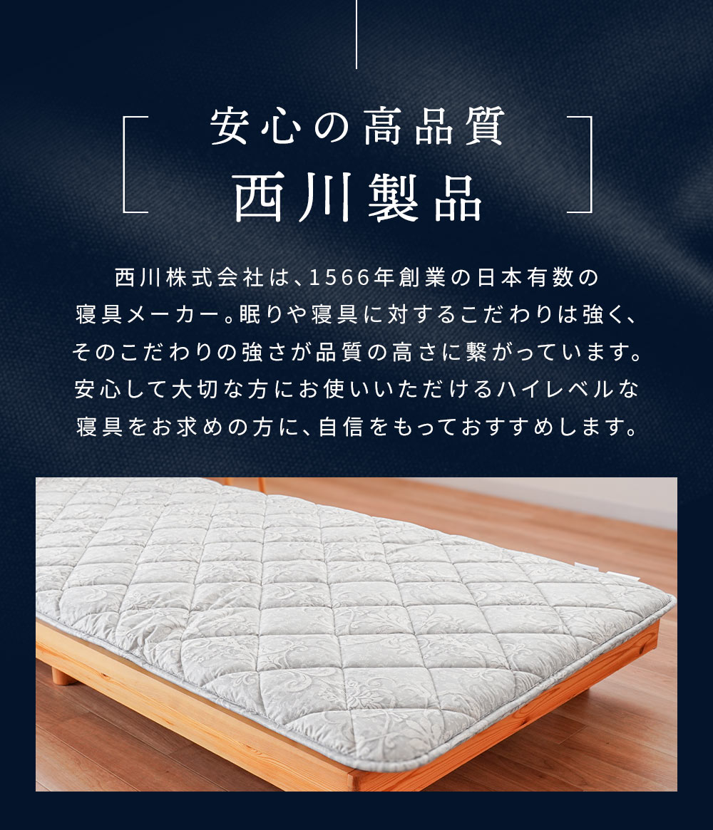 | ・固綿&羊毛混わた入りリバーシブル3層敷き布団について ほどよい硬さで体をしっかり支え、ほんのり暖かみと弾力性のある羊毛混わた入り。機能性に優れた羊毛を使用し、表面には羊毛混わた、裏面にはポリエステルわたを採用。3層構造で快適な寝心地を実現しました。普段使いはもちろん来客用にもおすすめです。 ・ウール入りだから弾力性や快適性アップ中わたに吸湿発散性に優れたウールを使用しているので、汗をかいてもムレにくく快適です。また弾力性が高く、やわらかな風合いで、しっかりと暖かさをキープします。 ・快眠の秘訣、しっかり固綿入り三層構造 しっかりめのフラットな固わたが入っているので、底付き感はあまり感じません。ポリエステル固綿を羊毛50%混の中綿で包んだ三層構造で体を支えます。 表面には暖かい羊毛混わた、裏面は通気性の良いポリエステルわたを使用。季節やお好みに合わせて、ウール面とポリエステル面を使い分けられるリバーシブル仕様です。 ・心地良い状態が長続きするキルト手間をかけてでも丁寧なキルト縫製を行いました。しっかりとしたキルト縫製により、中綿が偏りにくく、快適な使い心地が長持ちします。 ・取り扱いラクラク上げ下ろし簡単女性でも上げ下ろしカンタンな重さ。敷きっぱなしは湿気が気になるという方でも気軽にメンテナンス可能。少し重さがありますが、その分しっかりとした作りです。 ・安心の高品質、西川製品西川株式会社は、1566年創業の日本有数の寝具メーカー。眠りや寝具に対するこだわりは強く、そのこだわりの強さが品質の高さに繋がっています。 安心して大切な方にお使いいただけるハイレベルな寝具をお求めの方に、自信をもっておすすめします。 | |
