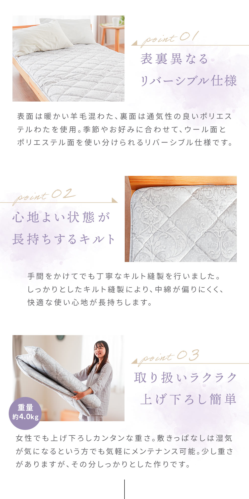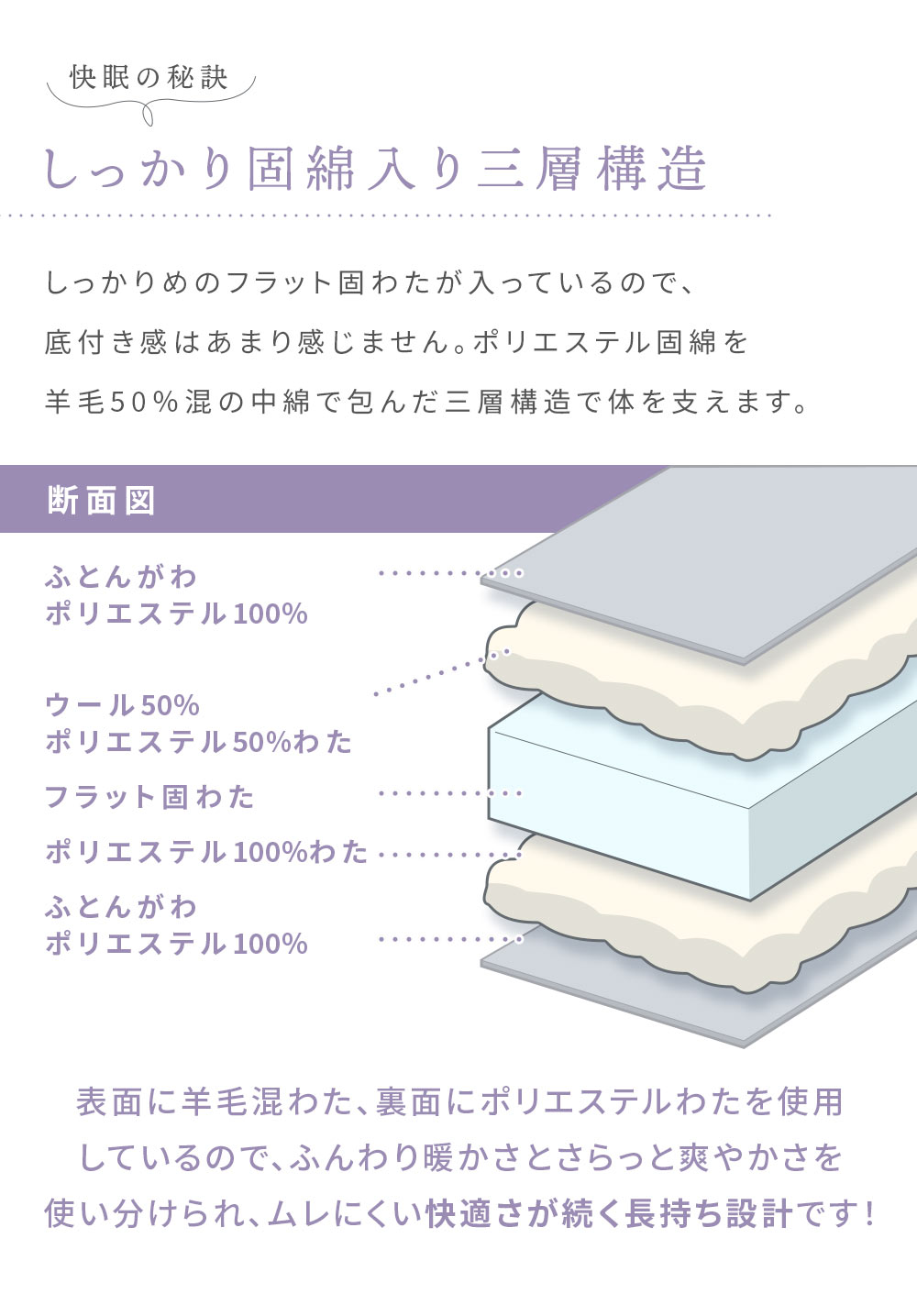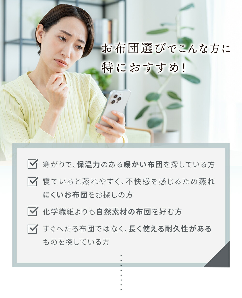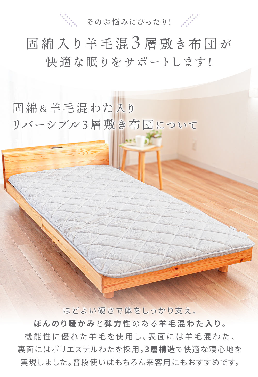 | ・固綿&羊毛混わた入りリバーシブル3層敷き布団について ほどよい硬さで体をしっかり支え、ほんのり暖かみと弾力性のある羊毛混わた入り。機能性に優れた羊毛を使用し、表面には羊毛混わた、裏面にはポリエステルわたを採用。3層構造で快適な寝心地を実現しました。普段使いはもちろん来客用にもおすすめです。 ・ウール入りだから弾力性や快適性アップ中わたに吸湿発散性に優れたウールを使用しているので、汗をかいてもムレにくく快適です。また弾力性が高く、やわらかな風合いで、しっかりと暖かさをキープします。 ・快眠の秘訣、しっかり固綿入り三層構造 しっかりめのフラットな固わたが入っているので、底付き感はあまり感じません。ポリエステル固綿を羊毛50%混の中綿で包んだ三層構造で体を支えます。 表面には暖かい羊毛混わた、裏面は通気性の良いポリエステルわたを使用。季節やお好みに合わせて、ウール面とポリエステル面を使い分けられるリバーシブル仕様です。 ・心地良い状態が長続きするキルト手間をかけてでも丁寧なキルト縫製を行いました。しっかりとしたキルト縫製により、中綿が偏りにくく、快適な使い心地が長持ちします。 ・取り扱いラクラク上げ下ろし簡単女性でも上げ下ろしカンタンな重さ。敷きっぱなしは湿気が気になるという方でも気軽にメンテナンス可能。少し重さがありますが、その分しっかりとした作りです。 ・安心の高品質、西川製品西川株式会社は、1566年創業の日本有数の寝具メーカー。眠りや寝具に対するこだわりは強く、そのこだわりの強さが品質の高さに繋がっています。 安心して大切な方にお使いいただけるハイレベルな寝具をお求めの方に、自信をもっておすすめします。 | |