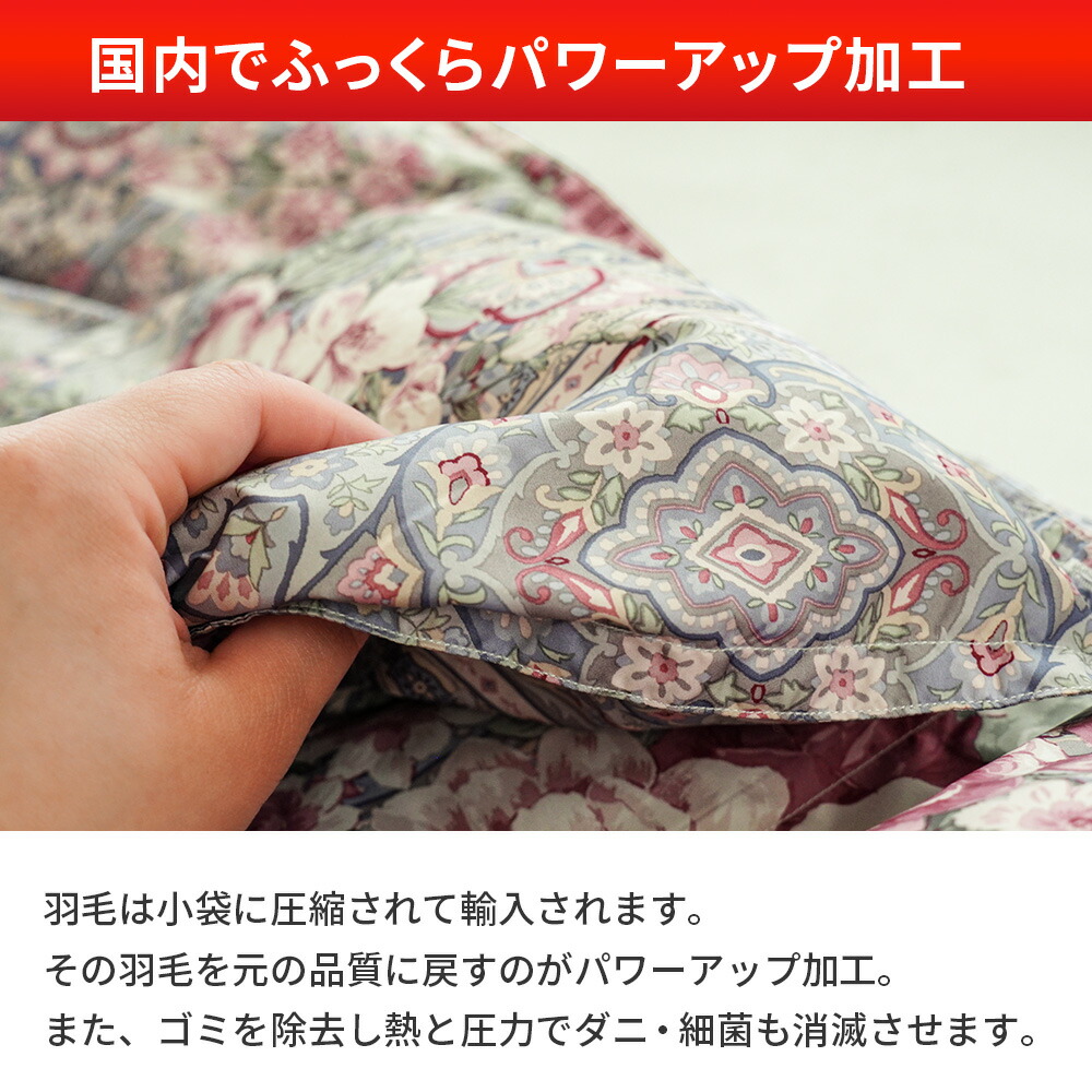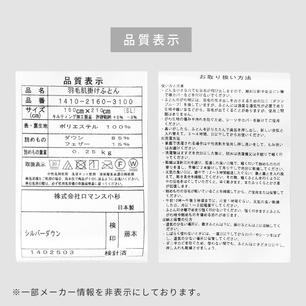 | ・軽くて程よいぬくもり 詰め物には、上質なシルバーダックダウン85%使用。ダウン量は、夏用に適した『250g』入り。そのため軽量でありながら、適度な保温力を発揮します。 ・国内でふっくらパワーアップ加工羽毛は小さな袋に大量に圧縮されて輸入されます。 その圧縮された羽毛を、本来の品質に復元させるのが このパワーアップ加工です。 復元だけでなく、混入したファイバーや ゴミを除去し、高熱と高圧でダニや 細菌も消滅させてくれるのです。 ・夏に1枚でちょうどいい、寝冷え防止にも薄手の仕上がりに加えて適度な保温力で、冷房からの冷え対策や、春・秋の肌寒い季節での使用に最適です。 特にちょっとした寒さを感じやすい寒がりさんにはぜひ試していただきたい、おすすめの一枚です。 ・ご家庭でお洗濯可能寝汗や汚れが気になってもご家庭で簡単に丸洗いOK! 羽毛は水に濡れると特有の匂いを増強させますが、きちんと乾かすとおさまりますので、お洗濯は天気の良い日をお選びください。 ・京都発の老舗メーカー「ロマンス小杉」製品創業70年を超える老舗寝具メーカーロマンス小杉は、お使いくださるお客様の寝心地、使い心地を追及する「ものづくり」にチャレンジしています。 | |