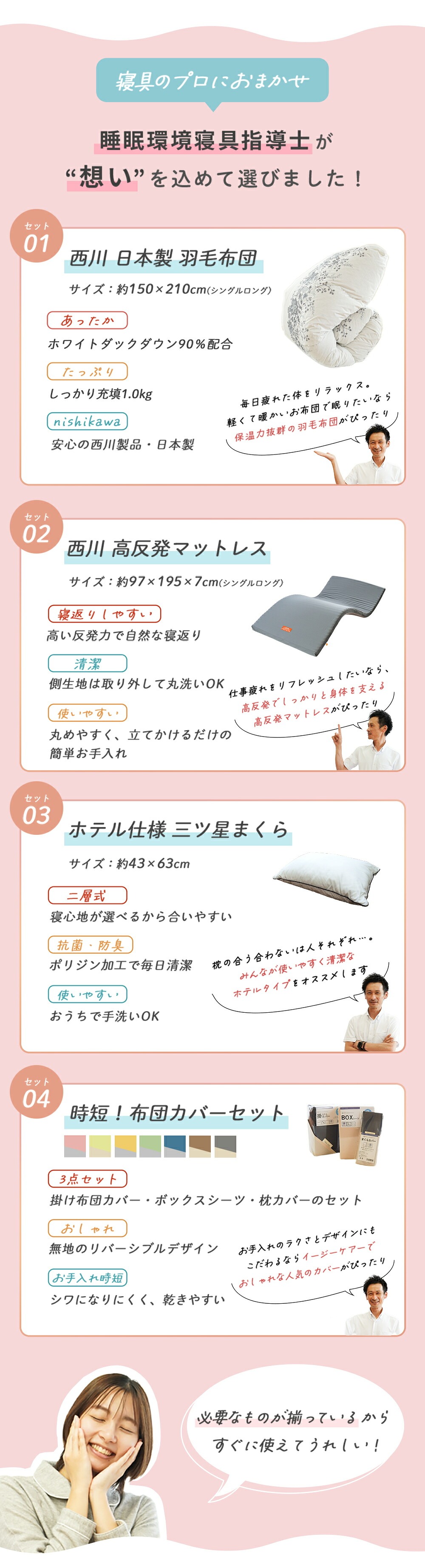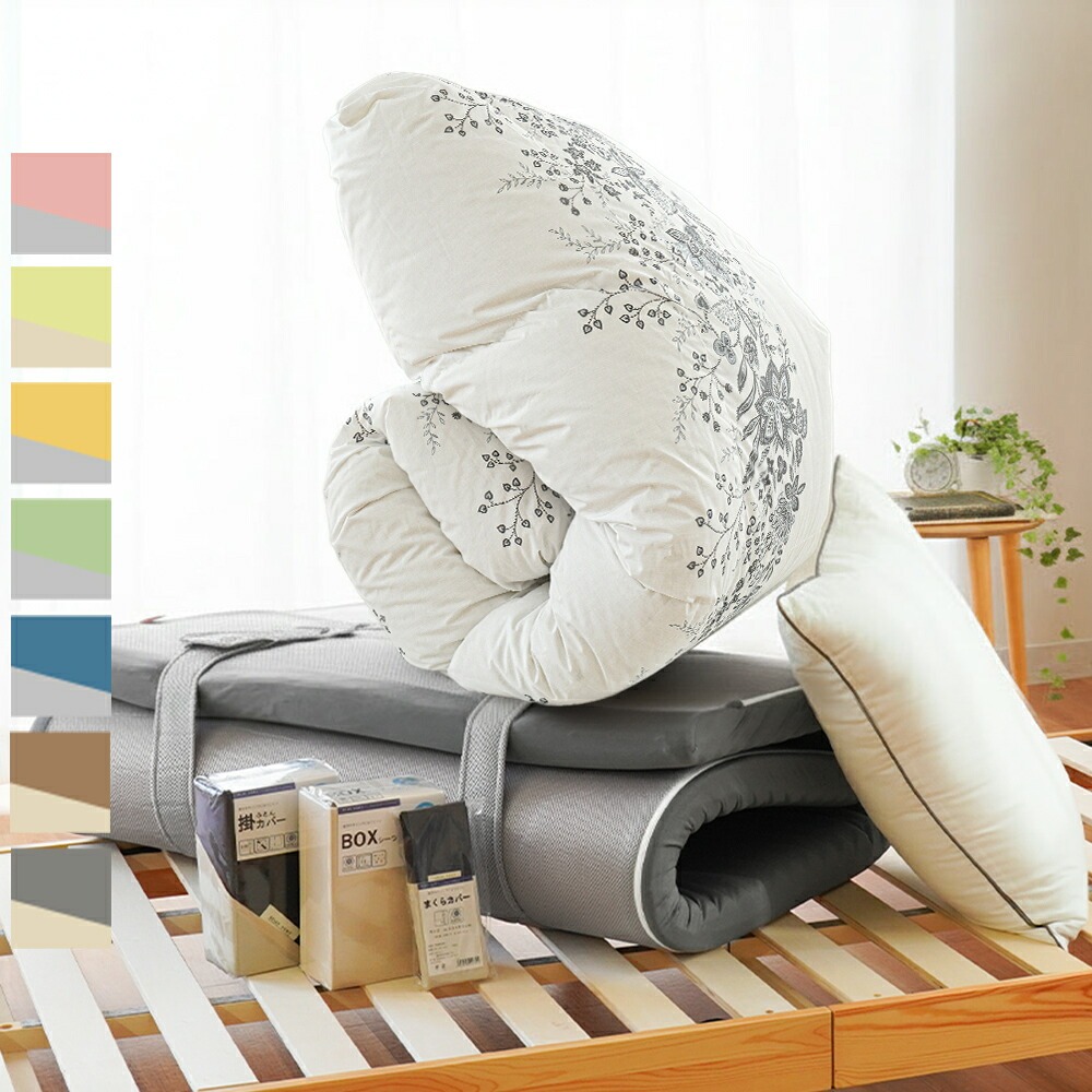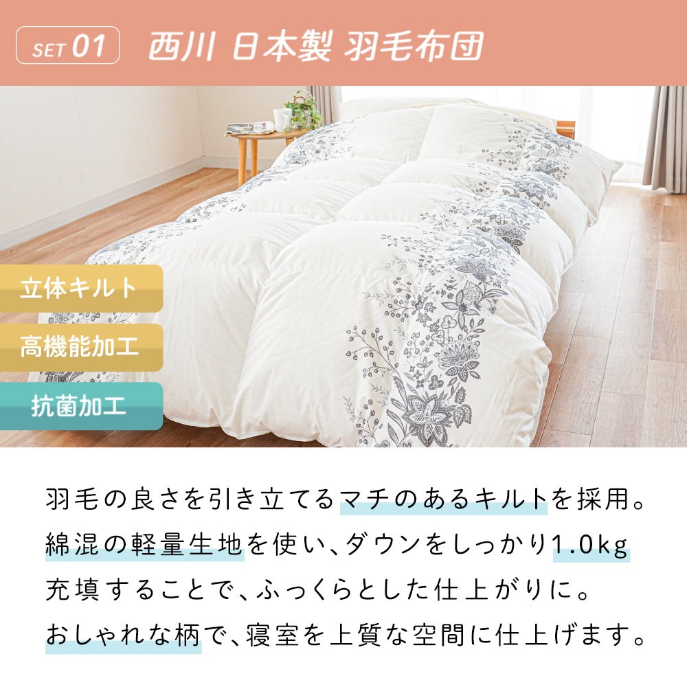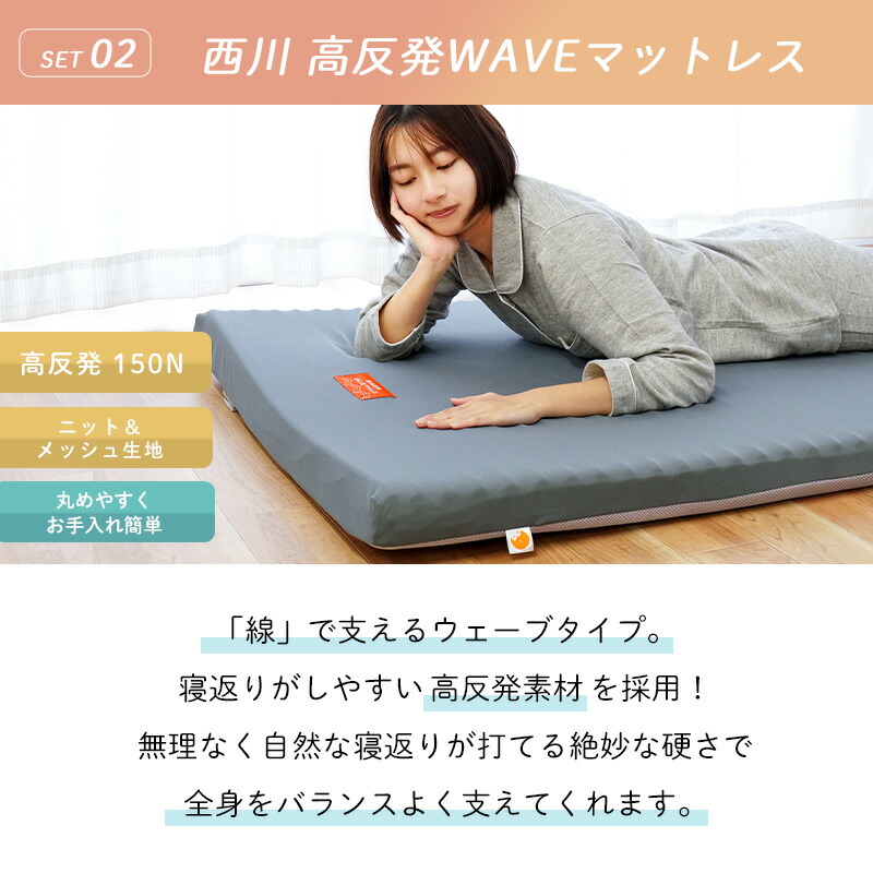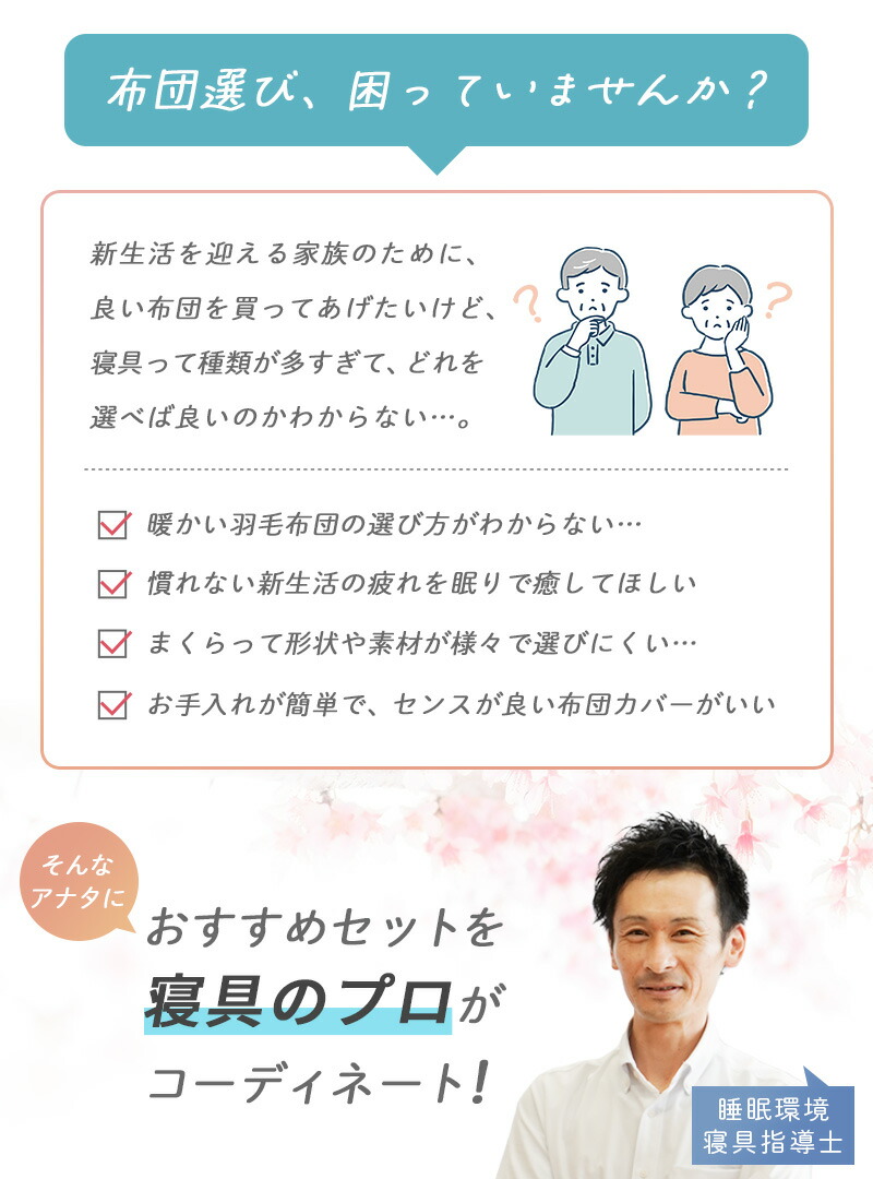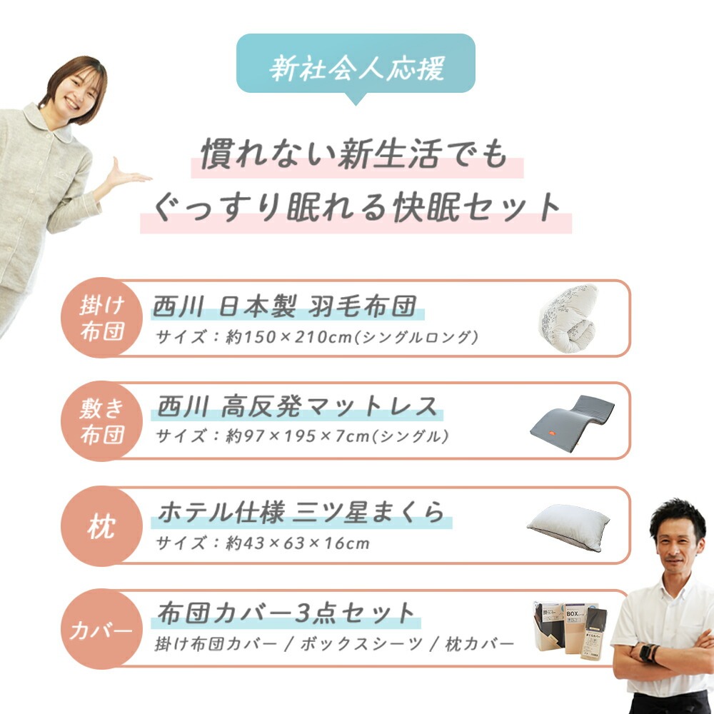 | ・慣れない新生活でもぐっすり眠れる快眠セット 新生活を始める皆さんへ、少しでもお役に立ちたくて快眠できるセットを考えてみました。西川の羽毛が片寄りにくい充填1.2kgの軽量羽毛布団、寝返りしやすい高反発WAVEマットレス、ふっくらした感触のホテルモードまくら。新しい環境で緊張した身体のことを考えて、快眠できるセットになっています。迷った時は是非参考にしてください。 ・創業50周年以上の老舗ふとん屋が選んでいます。当社は地域に根付いた企業として、長年営業してきました。睡眠環境寝具指導士、ピローアドバイザー、などの眠りのプロが多数在籍しており、お客様に安心して良質な寝具をお買い求めいただけるよう日々努めております。 ・西川の高品質羽毛布団羽毛の良さを引き立てるマチのあるキルトを採用。綿混の軽量生地を使い、ダウンをしっかり1.0kg充填することで、ふっくらとした仕上がりに。おしゃれな柄で、寝室を上質な空間に仕上げます。 ・寝心地を考えた西川の高反発WAVEマットレス「線」で支えるウェーブタイプ。寝返りがしやすい高反発素材を採用!無理なく自然な寝返りが打てる絶妙な硬さです。全身をバランスよく支えます。丸めやすく、ベルトでサクッとロール状に。使わないときは立てかけて湿気対策! ・リッチな寝心地のホテル仕様枕好きな方を上にして使える2層式。手洗いでのお洗濯が可能なので清潔にお使いいただけます。100回洗濯しても持続する抗菌・防臭加工が施されています。 | |