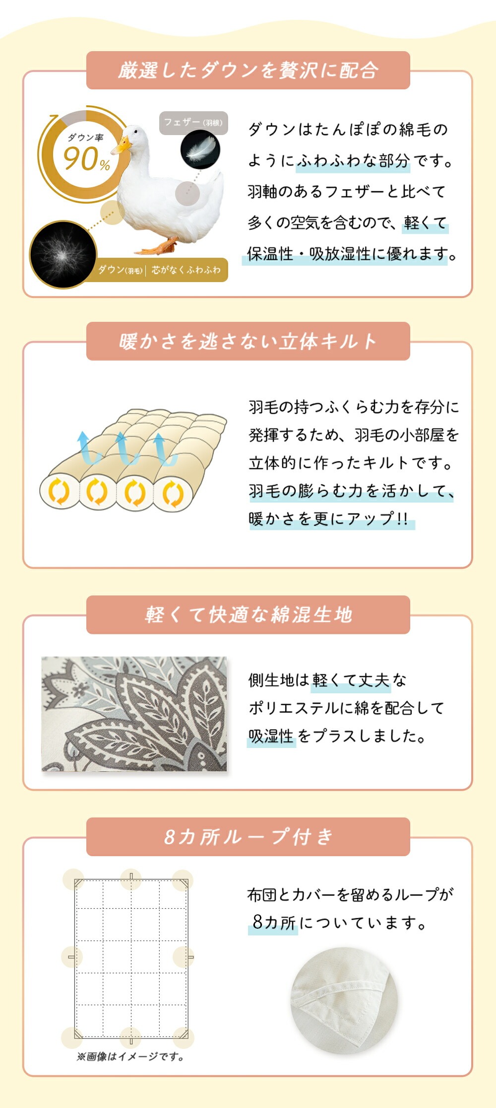 | 仕様 | イギリス産ホワイトダックダウン |