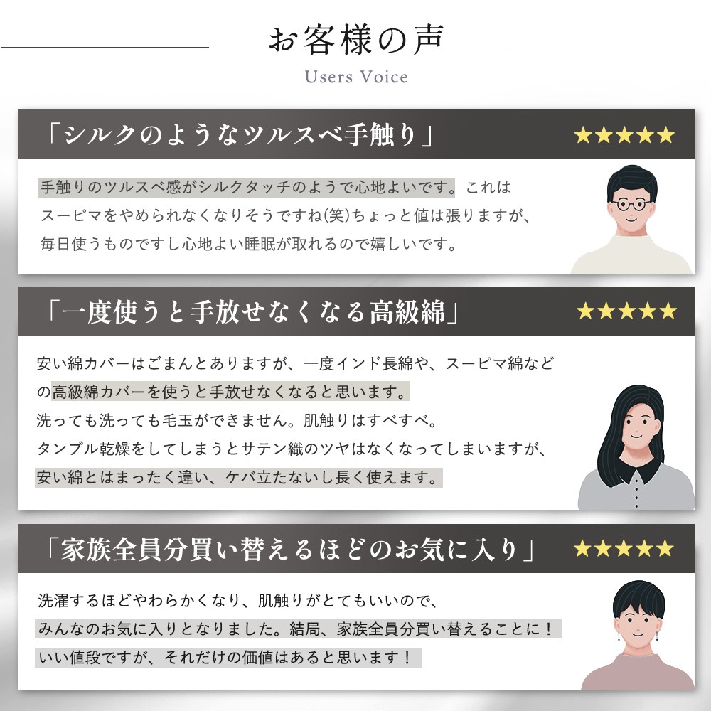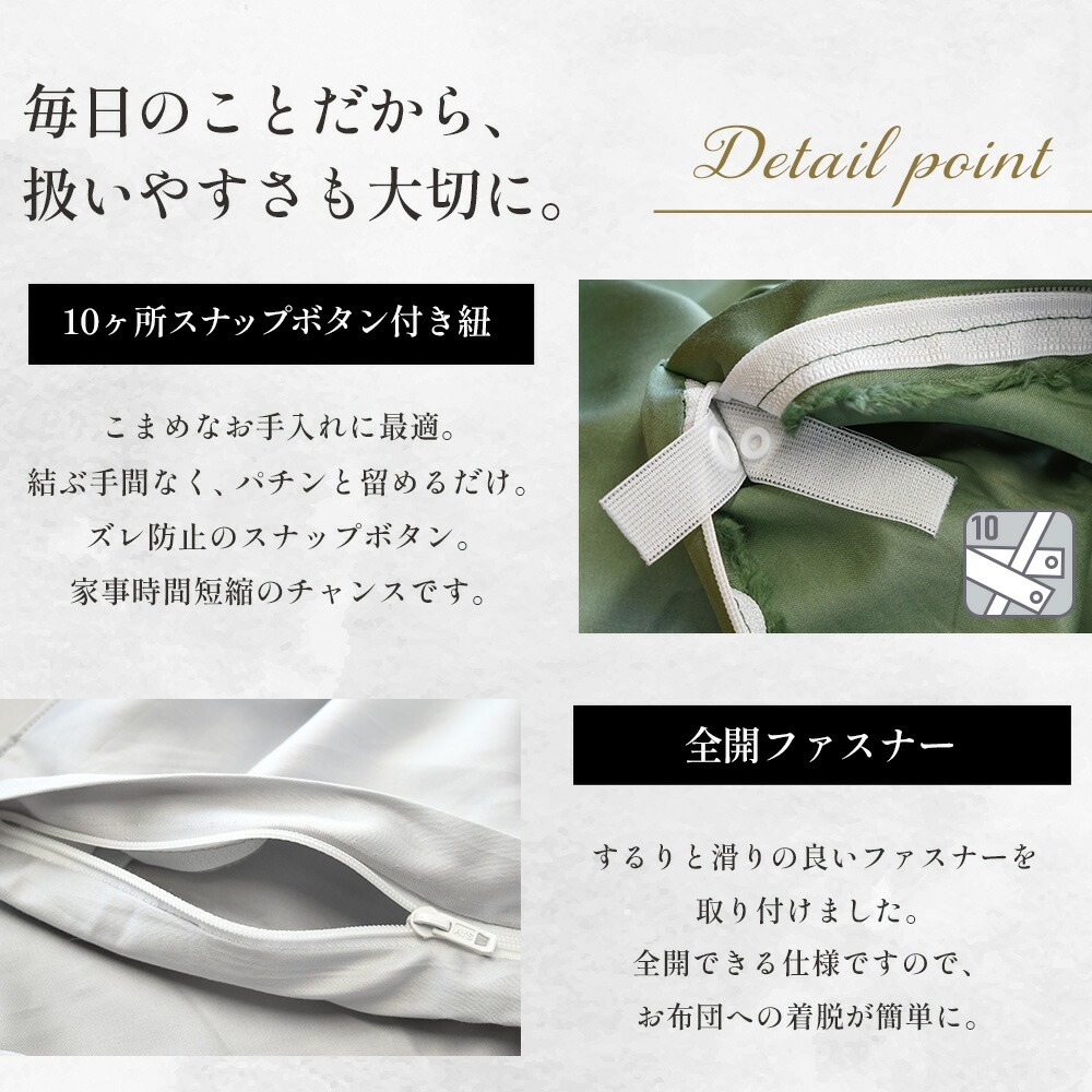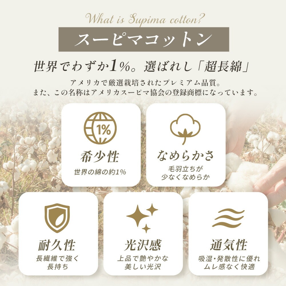 | ・R・C・S 自然から生まれた色と、こだわり抜かれた素材を選べるブランドシリーズの商品です。インテリアにも調和する心落ち着くナチュラルなロマンスカラーで、安眠・心地良さ・快適さをお届けします。 ・スーピマ綿「スーピマ」はアメリカスーピマ協会に認められた上質なピマ綿を使用した超長綿繊維です。 均整な表面を持っているため、肌触りが非常になめらかです。洗濯後も、ソフトな肌触りが保たれます。つややかな光沢としなやかさを持つ単糸を使い60番手のサテン地で織り上げています。 ・持ちよく寝るために高価な羽毛布団等とあわせて購入いただけるとより最高の寝心地に、安価な羽毛布団と合わせると安い羽毛が高い羽毛に生まれ変わったような寝心地に。最終的に肌に触れるカバーを良いものにすることは、気持ち良い眠りにも大切です。もちろん羽毛以外の布団にもお勧めです。 | |