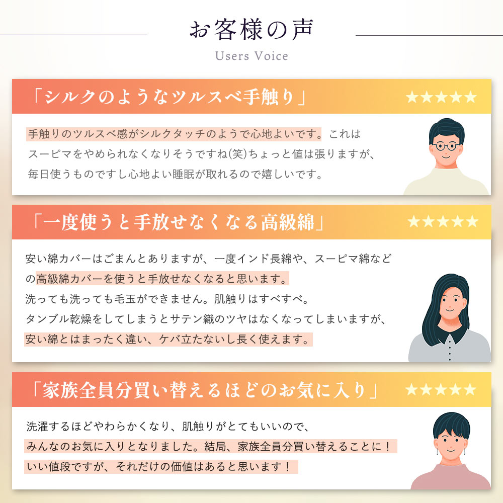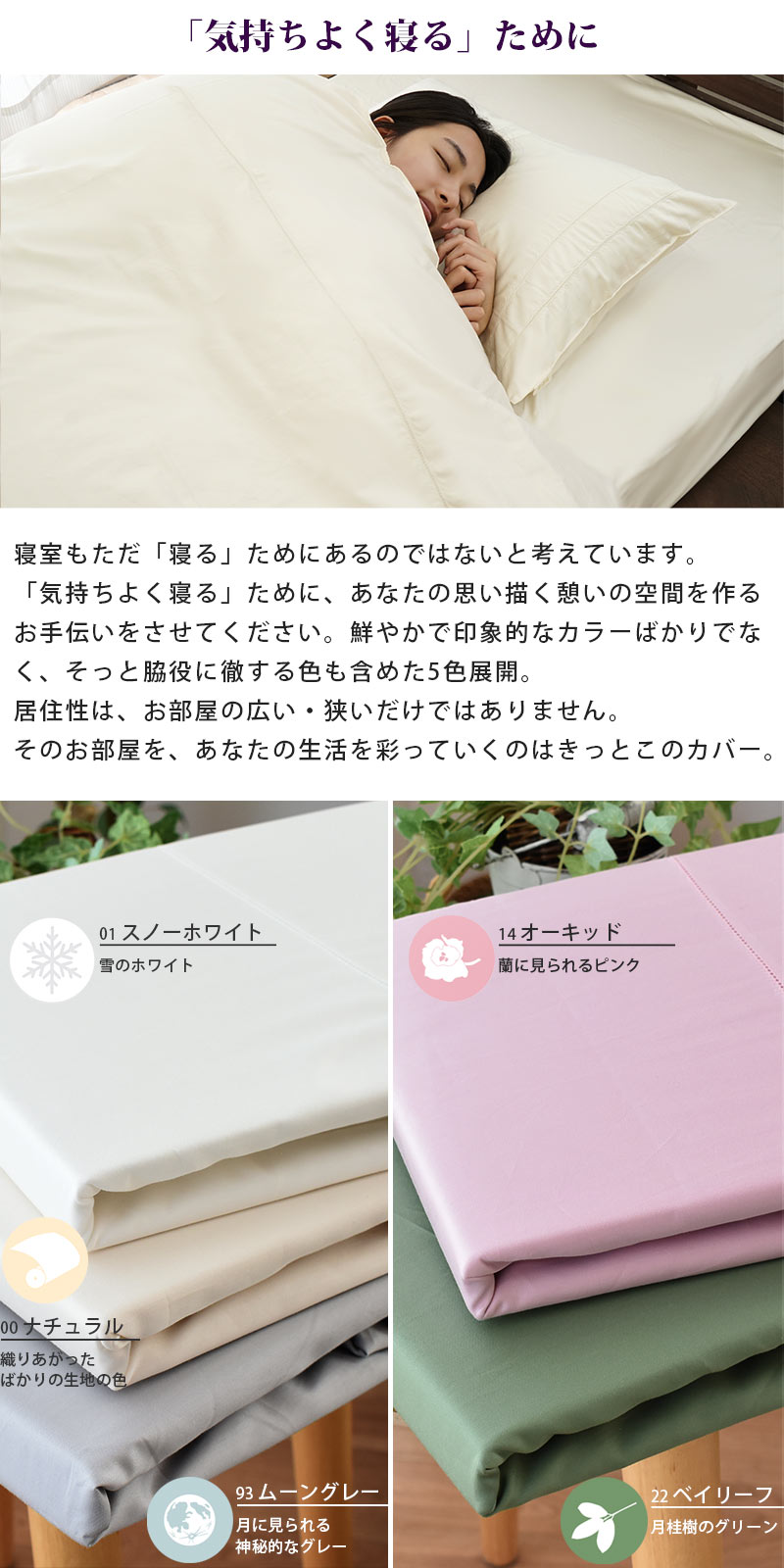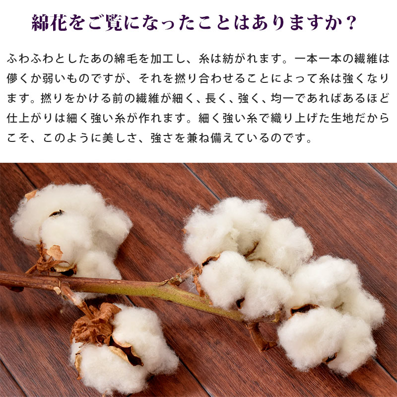 天然素材のコットンは吸湿性に優れ、スーピマならではの美しい光沢としなやかな肌触りが魅力のカバーです。