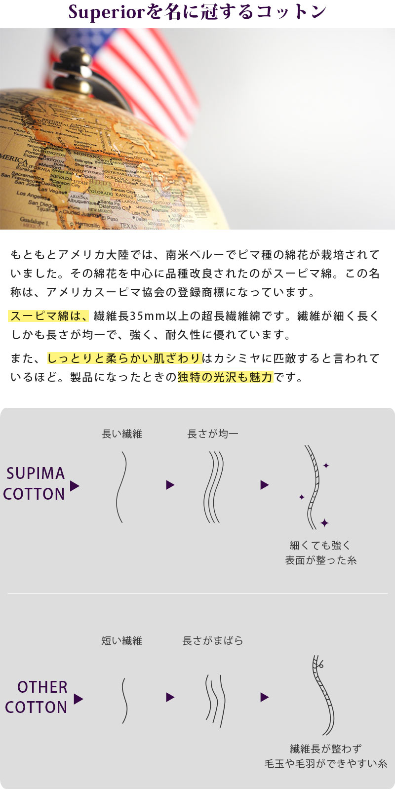 スーピマ綿は繊維が細く長く、しかも長さが均一で、強く、耐久性に優れています。また、しっとりと柔らかい肌触りはカシミヤに匹敵すると言われているほど。