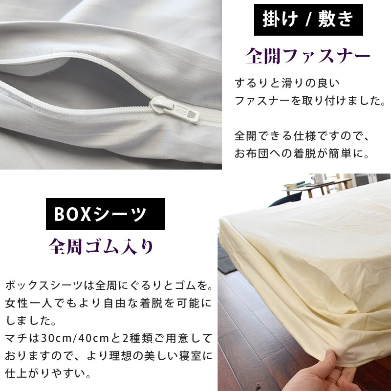 | 仕様 | 全周ゴム入り マチ30cm(厚み25cmまで対応) 超長綿「スーピマ」 打ち込み本数:280(170×110)本 60サテン 抗菌防臭加工 両サイドマチ部分に継ぎ目(ハギ)あり |