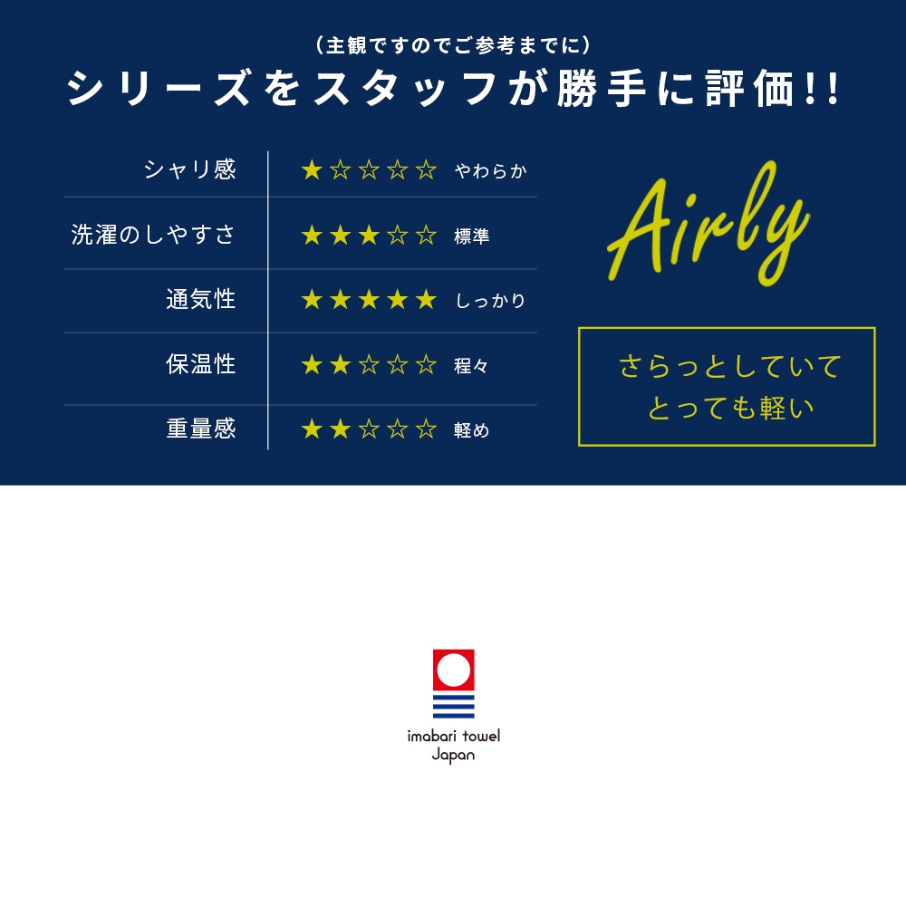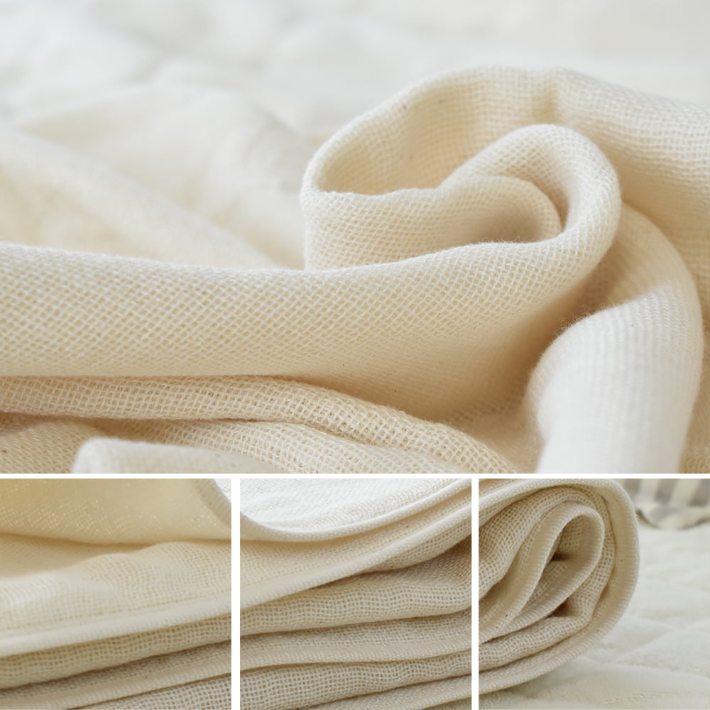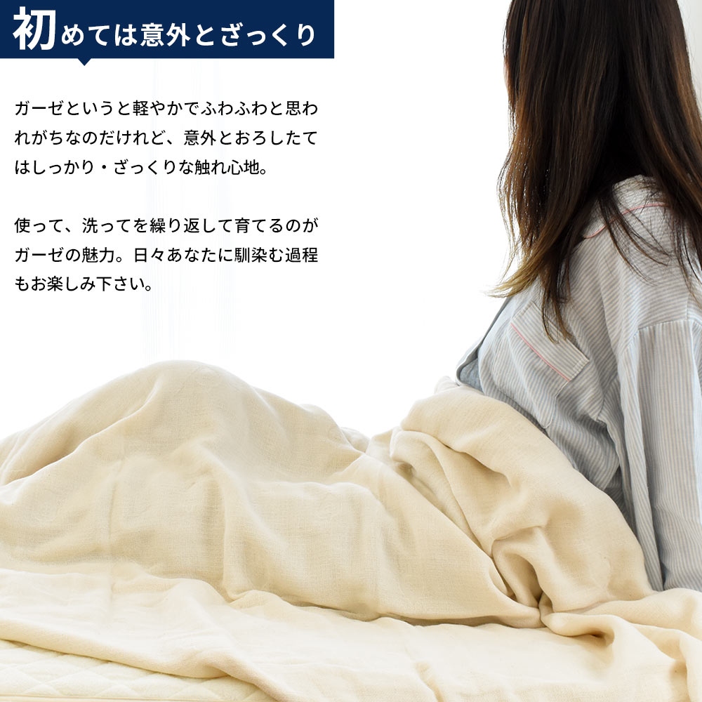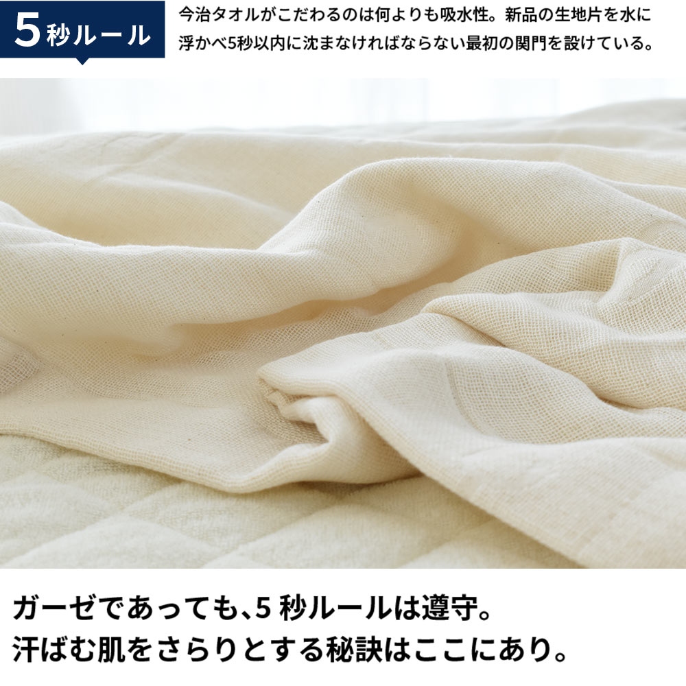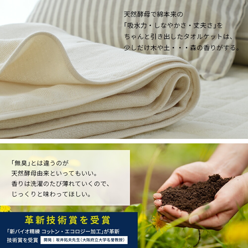 | ・5秒ルール 今治タオルがこだわるのは何よりも吸水性。新品の生地片を水に浮かべ5秒以内に沈まなければならない最初の関門を設けている。ガーゼであっても、5秒ルールは遵守。汗ばむ肌をさらりとする秘訣はここにあり。 ・染めないという選択大地に育まれたコットンを紡ぎ、織り、生地にする。脱色も染色もしない。自然のままだから、派手さや甘さはないかもしれない。けれど、そこにあるのは究極の素朴さ。色は、天然の綿の色。脱色も染色もやめたら、こんなにも愛しい色が隠れていた。 ・初めては意外とざっくりガーゼというと軽やかでふわふわと思われがちなのだけれど、意外とおろしたてはしっかり・ざっくりな触れ心地。使って、洗ってを繰り返して育てるのがガーゼの魅力。日々あなたに馴染む過程もお楽しみ下さい。 ・天然酵母で綿本来の力を引き出す天然酵母で綿本来の「吸水力・しなやかさ・丈夫さ」をちゃんと引き出したタオルケットは、少しだけ木や土・・・森の香りがする。「無臭」とは違うのが天然酵母由来といってもいい。香りは洗濯のたび薄れていくので、じっくりと味わってほしい。 ・革新技術賞を受賞「新バイオ精練 コットン・エコロジー加工」が革新技術賞を受賞。開発|坂井拓夫先生(大阪府立大学名誉教授)。 | |