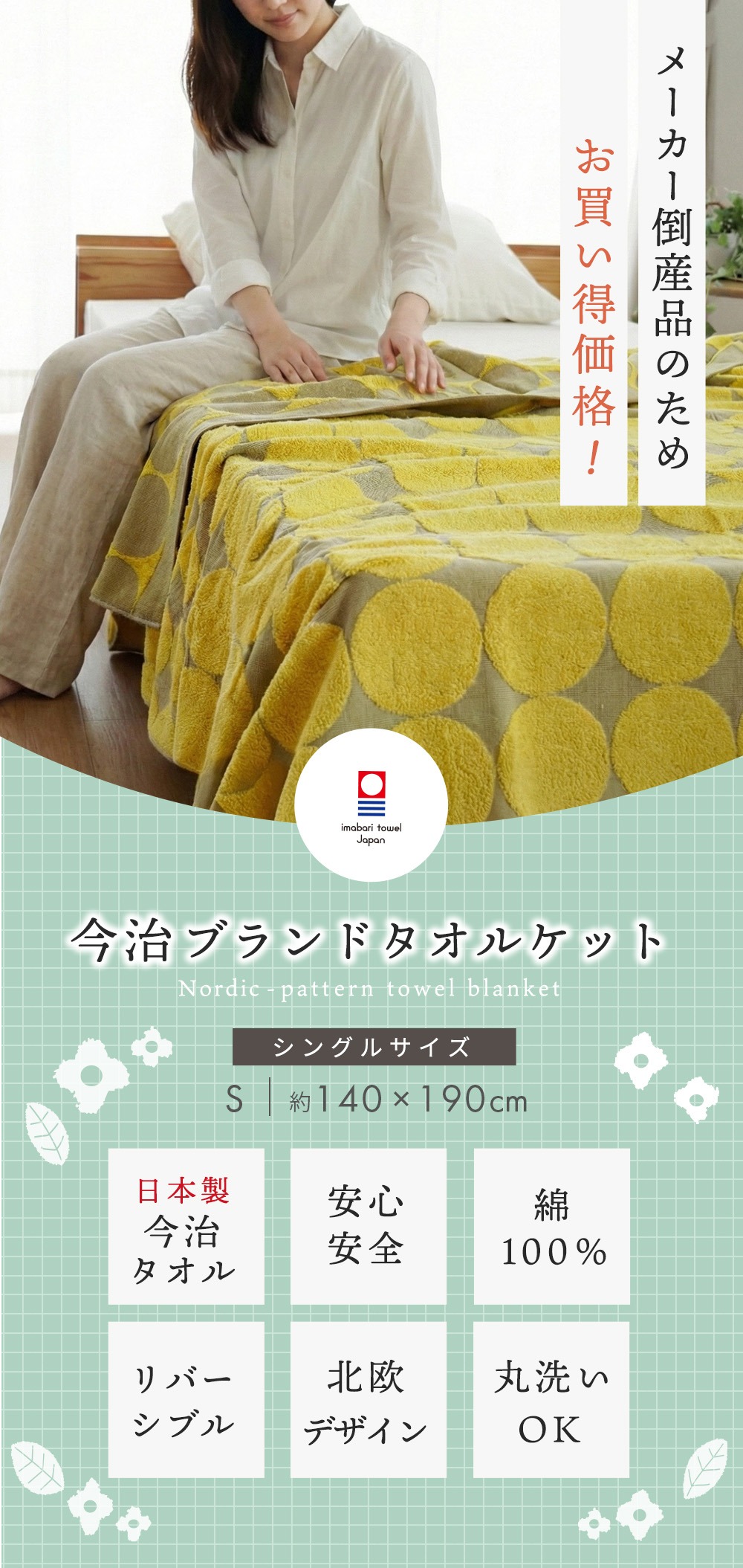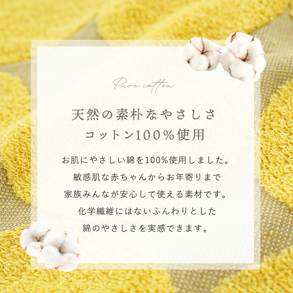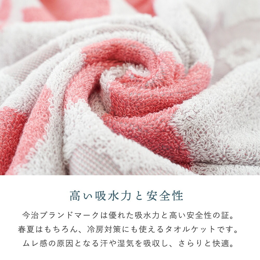 | ・今治タオルブランド認定の品質 優れた吸水性と安全が今治タオルの証。今治タオルのブランドマーク&ロゴは、日本最大のタオル産地「今治」で、独自の品質基準に合格したタオルのみに付与されます。 ・高い吸水力と安全性今治ブランドマークは優れた吸水力と高い安全性の証。春夏はもちろん、冷房対策にも使えるタオルケットです。ムレ感の原因となる汗や湿気を吸収し、さらりと快適。 ・天然の素朴なやさしさ コットン100%使用お肌にやさしい綿を100%使用しました。敏感肌な赤ちゃんからお年寄りまで家族みんなが安心して使える素材です。化学繊維にはないふんわりとした綿のやさしさを実感できます。 ・お部屋のアクセントになる北欧調大きめモチーフが映えるデザインで、寝室を明るく演出。ベッドやソファーに掛けるだけでインテリアの主役に。 ・柄の出方が異なるリバーシブルデザイン表と裏で色の出方や印象が異なるリバーシブル仕様。気分やお部屋の雰囲気に合わせて使い分けができます。 ・丸洗いOKで清潔に使えるご家庭の洗濯機で洗えるので、毎日清潔にお使いいただけます。毎日使いにぴったりの実用性も魅力です。 | |