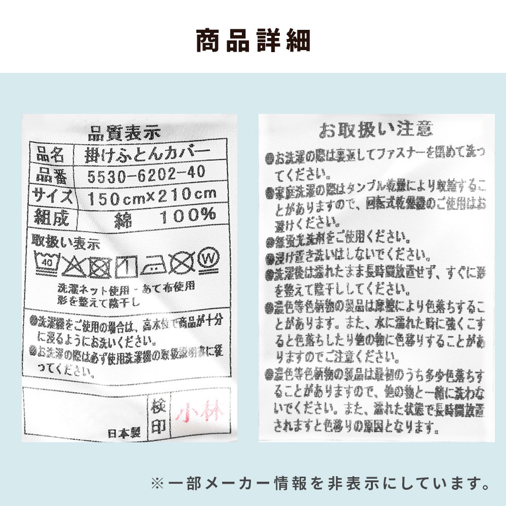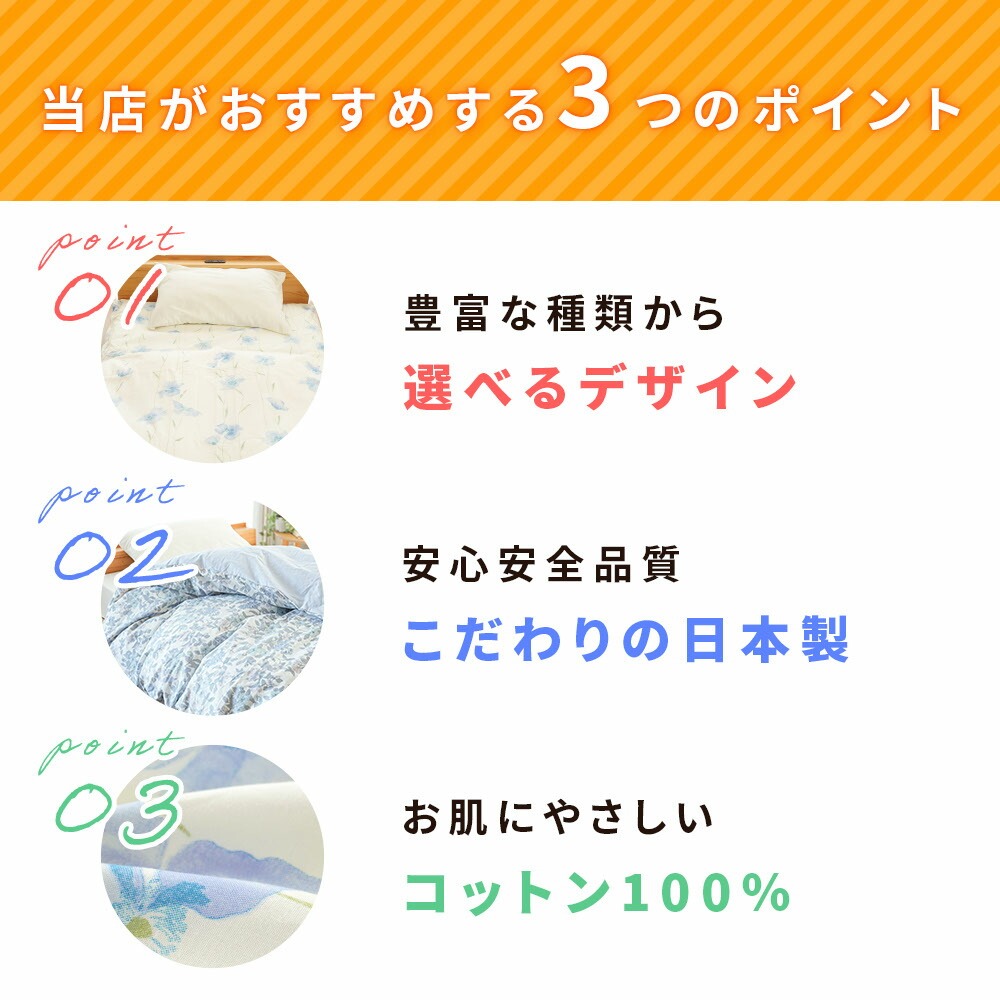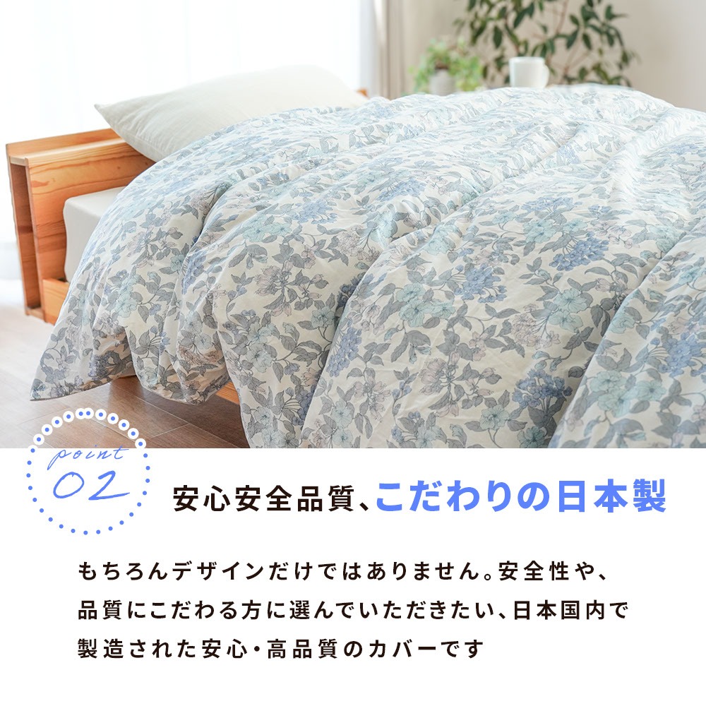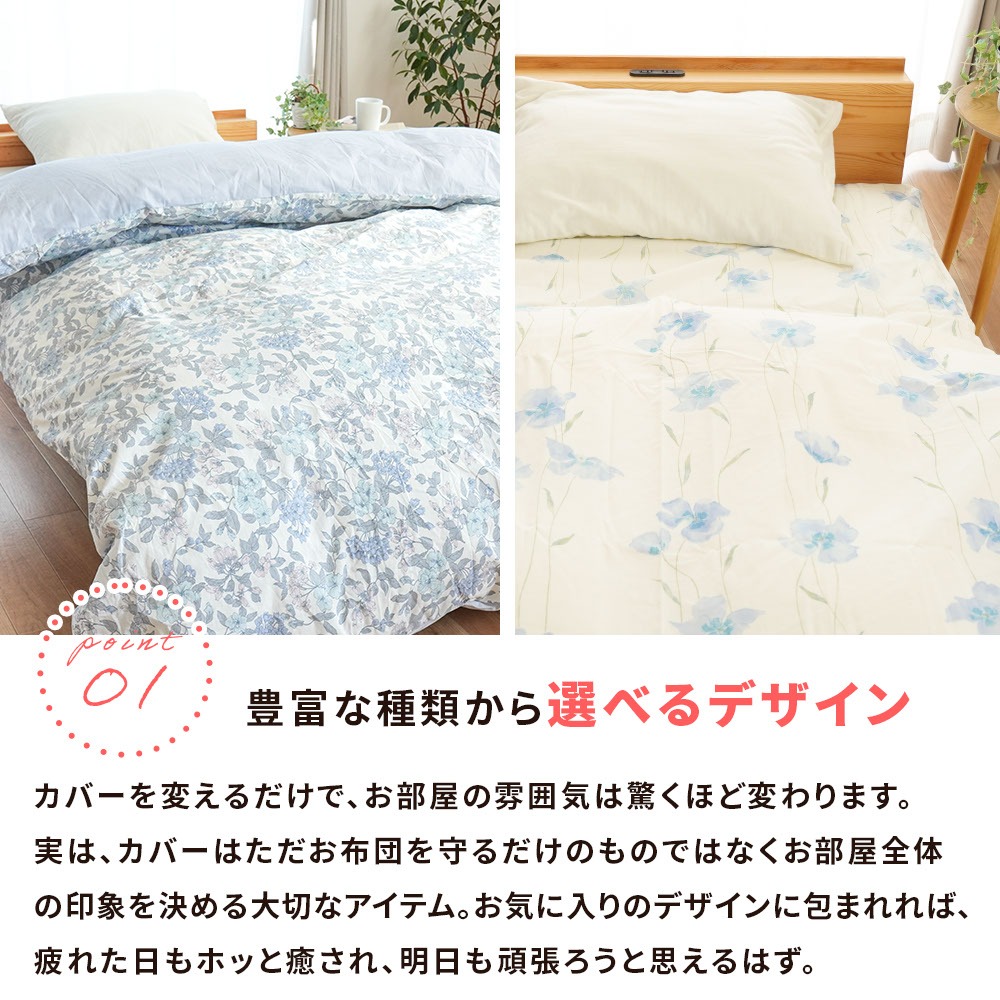 | ・豊富な種類から選べるデザイン カバーを変えるだけで、お部屋の雰囲気は驚くほど変わります。実は、カバーはただお布団を守るだけのものではなく、お部屋全体の印象を決める大切なアイテム。お気に入りのデザインに包まれれば、疲れた日もホッと癒され、明日も頑張ろうと思えるはず。 ・安心安全品質、こだわりの日本製もちろんデザインだけではありません。安全性や、品質にこだわる方に選んでいただきたい、日本国内で製造された安心・高品質のカバーです ・お肌にやさしいコットン100%赤ちゃんやお肌が敏感な方にも安心な天然素材のコットン100%の生地を使用。お肌に優しく、吸水性にも優れているため寝ている間にかいた汗をやさしく吸収。寝汗による寝冷えを防いでくれます。 | |