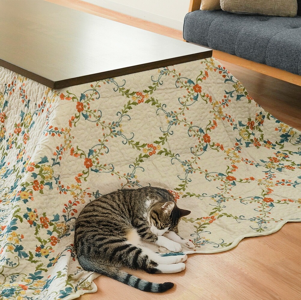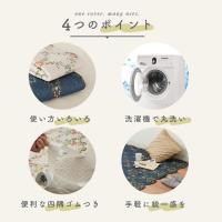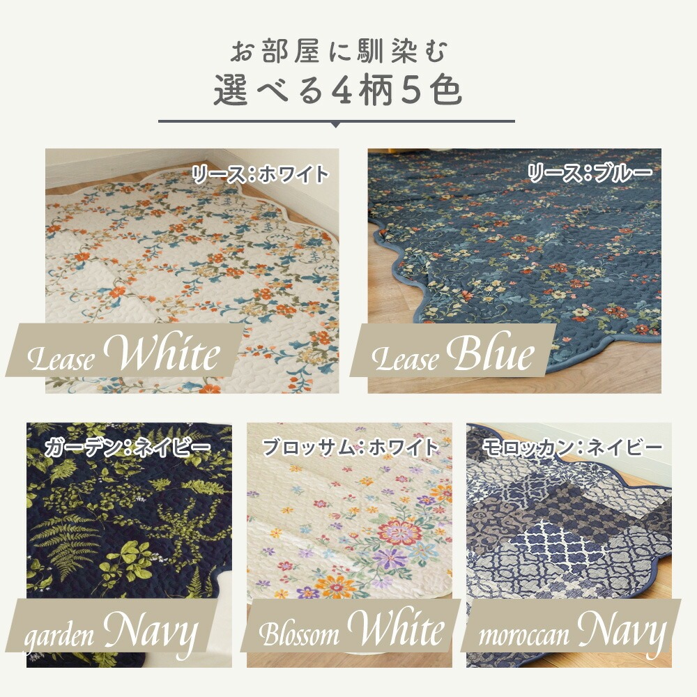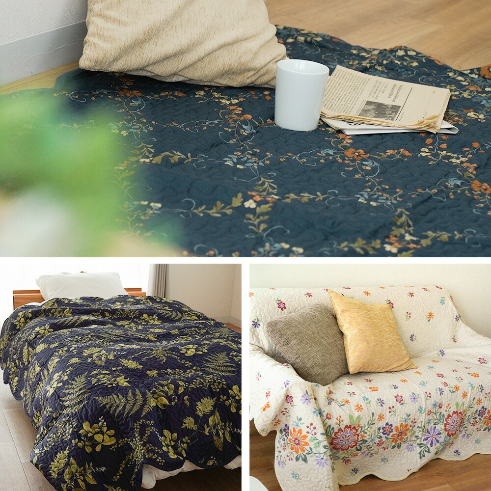 | ・お部屋になじむ、選べる4柄 ガーデン(ネイビー)、リース(ブルー・ホワイト)、ブロッサム(ホワイト)、モロッカン(ネイビー)の4柄5色から選べて、お部屋の雰囲気にぴったり合います。 ・サラッと爽やかなキルト生地ポコポコとした触れ心地の爽やかなキルト生地で、どんな季節でも使いやすい♪ ・四隅ゴム付き便利な四隅ゴムつきです。 ・洗濯機で丸洗いOKポリエステル100%素材だから、汚れても気軽に洗えて、乾くのも早い。中々洗えないソファなどの汚れ防止や、お子様がいるご家庭にもおすすめです。 | |