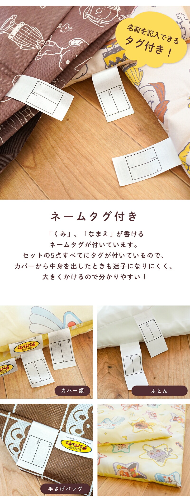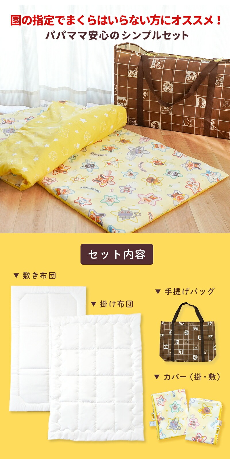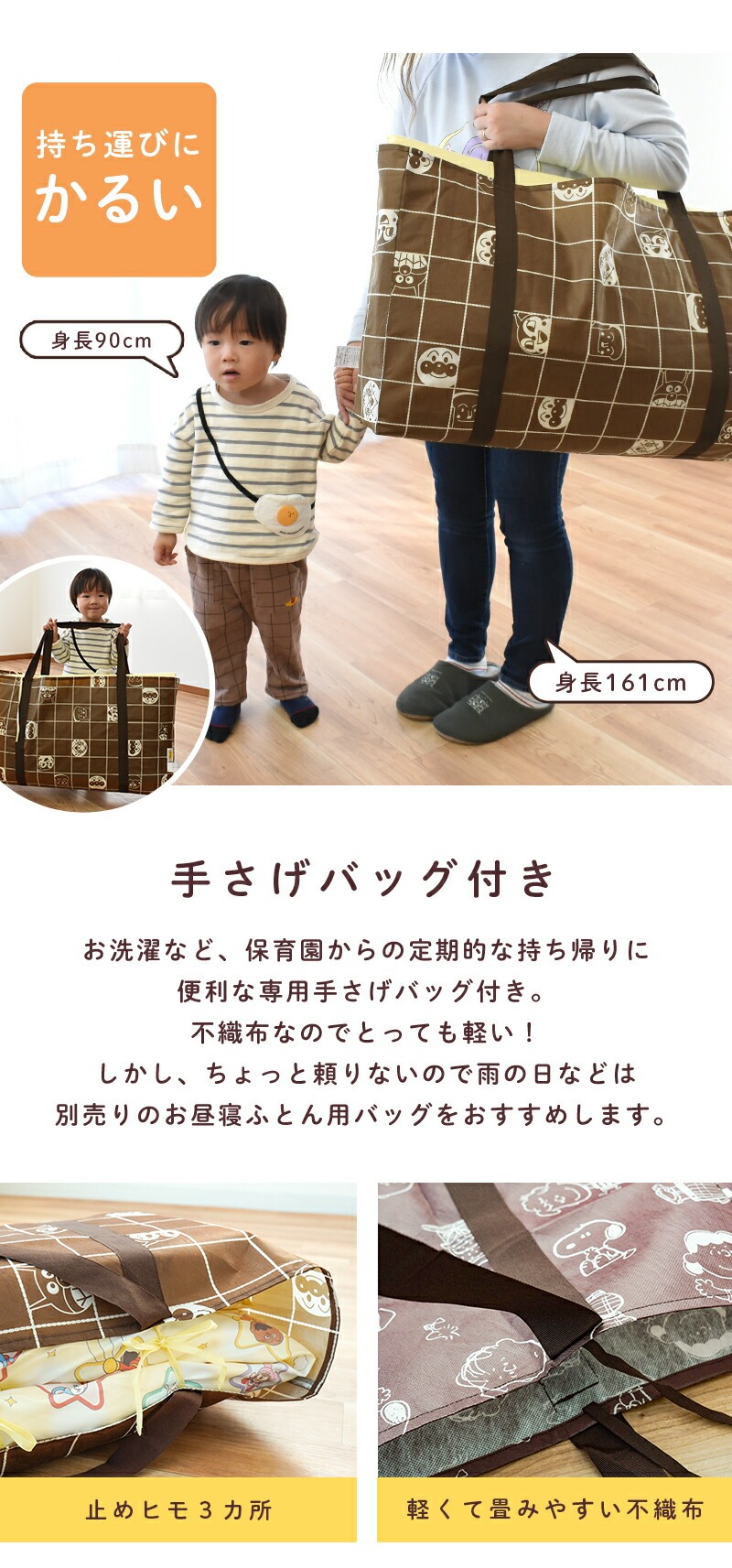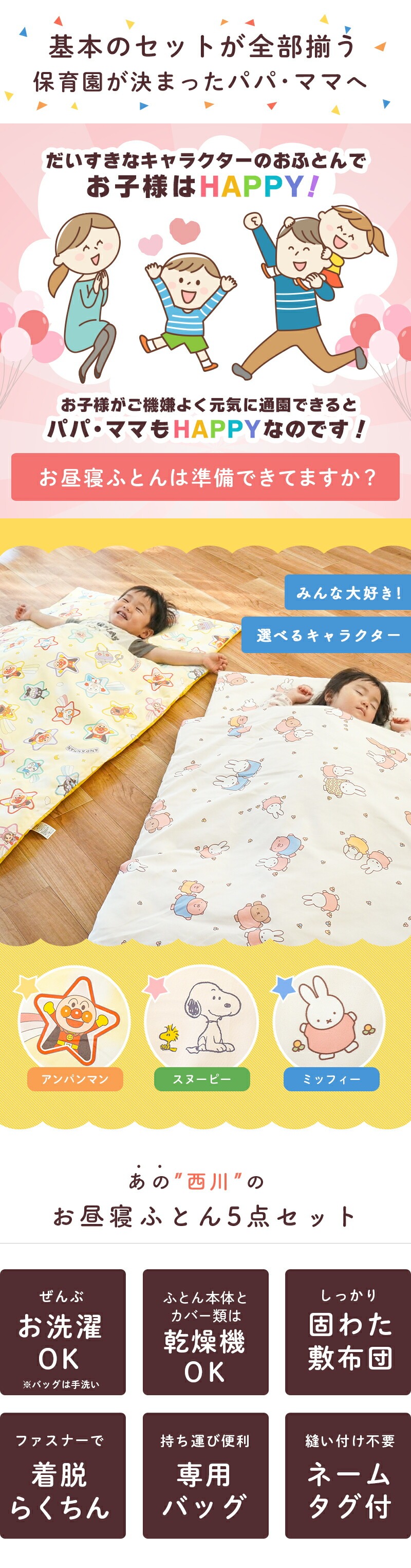 | ・洗濯機で洗えて清潔 カバー類はもちろん、掛け布団、敷き布団までもご家庭の洗濯機で洗えます。 掛け布団はホコリの出にくい合繊わた入り。敷き布団はしっかり固わたタイプ! 敷き布団の綿ずれ防止キルトを採用することで、洗濯機で洗っても中綿がズレないので快適。 ・ご家庭の乾燥機がが使える優れモノ!ふとん本体とカバー類が、タンブラー乾燥に対応!急なお洗濯も天候に左右されないので時短&安心です。 ・ファスナータイプ掛け布団カバーと敷き布団カバーは、取り付け・取り外しがしやすいファスナー式。 スライドしやすいファスナーで大きく開くので、お子さまの軽い力でも簡単にお布団の準備ができます。 園によってヒモ指定やファスナー指定が異なりますので、ご購入前に必ずご確認ください。 ・手さげバッグ付きお洗濯など、保育園からの定期的な持ち帰りに便利な専用手さげバッグ付き。 不織布なのでとっても軽い!しかし、ちょっと頼りないので雨の日などは別売りのお昼寝ふとん用バッグをおすすめします。 「くみ」、「なまえ」が書けるネームタグが付いています。 セットの5点すべてにタグが付いているので、カバーから中身を出したときも迷子になりにくく、大きく書けるので分かりやすい。 ・お昼寝ふとんってなに?お昼寝布団は、ベビー布団やベビー布団セットとは違って、保育園、幼稚園、での2∼3時間ぐらいのお昼寝専用に作られたものです。 保育園・幼稚園から持ち帰ることも考慮されているので 持ち運びやすさや、かさ張りにくさに重点が置かれています。 また、園児全員の布団を保育園・幼稚園の押し入れに片付ける必要や園児自身が自分で持ち運びする場合もあるので、 ベビー布団、ベビー布団セットよりも薄手で軽い作りになっています。 | |
