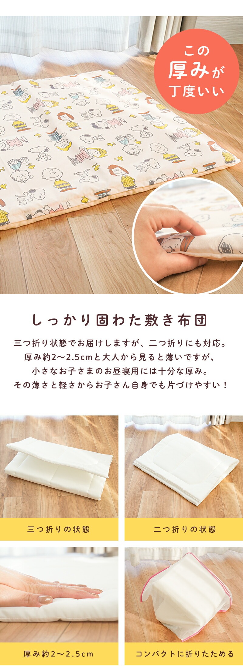 | ご使用上の注意事項 | ■この商品は、あくまでもお昼寝用としてのおふとんですので、長時間の睡眠には適しておりません。 |