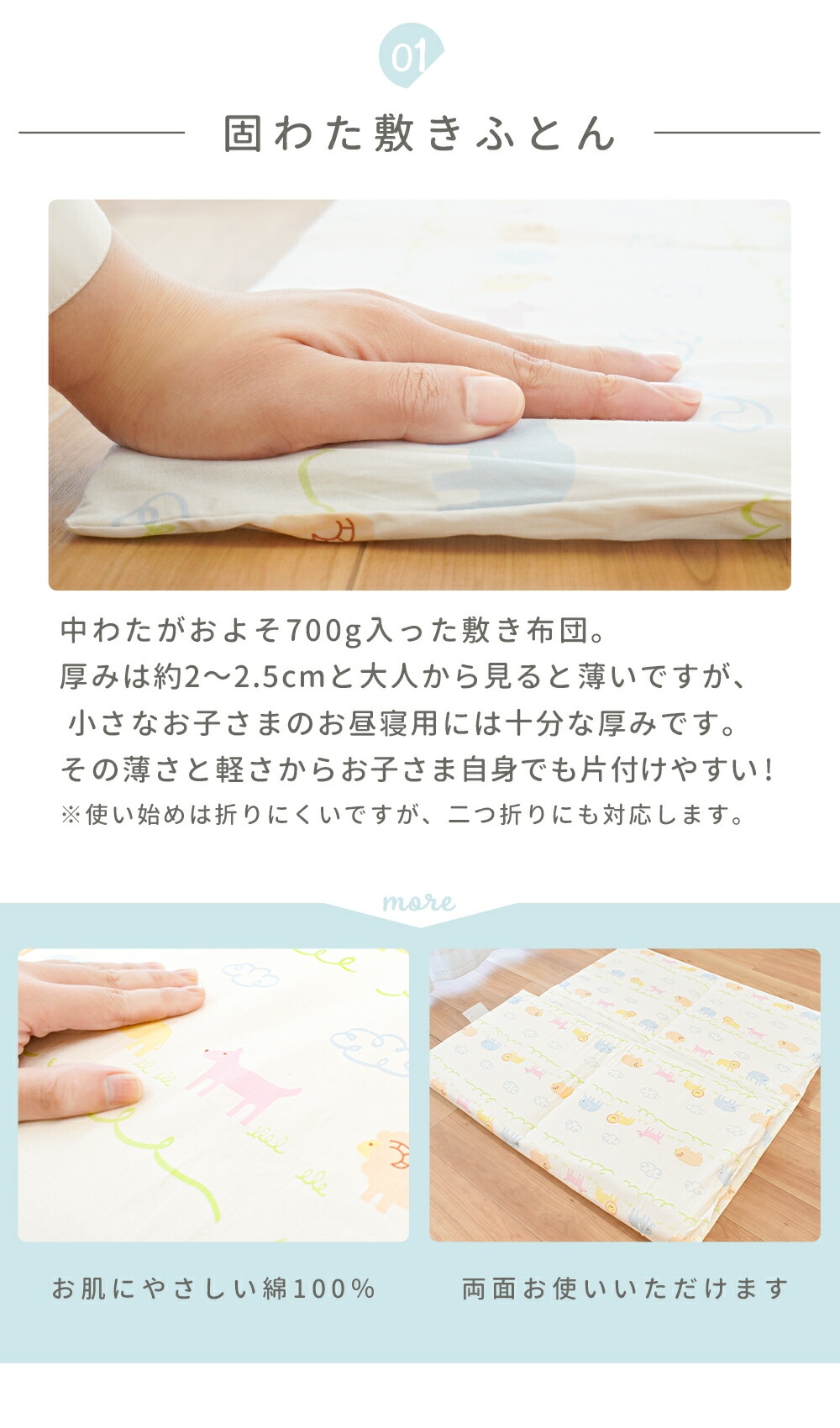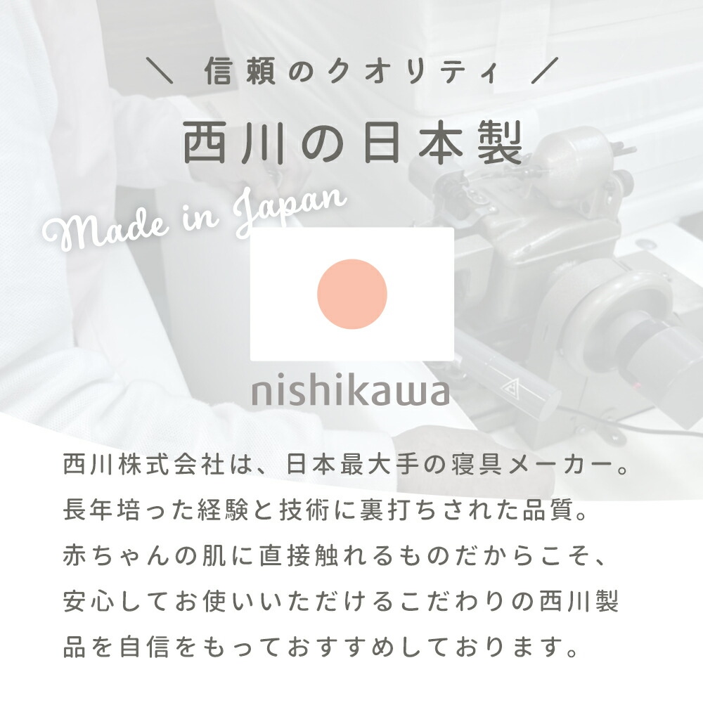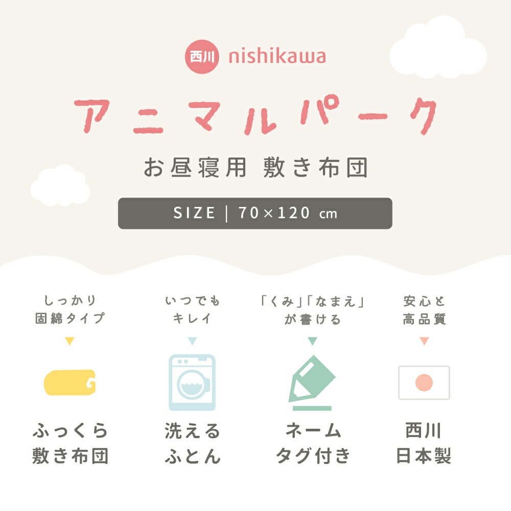| ・固わた敷きふとん 中わたがおよそ700g入った敷き布団。厚みは約2?2.5cmと大人から見ると薄いですが、小さなお子さまのお昼寝用には十分な厚みです。その薄さと軽さからお子さま自身でも片付けやすい!※使い始めは折りにくいですが、二つ折りにも対応します。 ・便利なネームタグ付き「くみ」「なまえ」を書き込めるネームタグ付き。大きめなのでひと目で分かりやすく、書きやすいです。 ・洗濯機で洗えて清潔コンパクトに畳めるので洗濯機でお洗濯OK。忙しい家事や育児に大助かりです。※ドラム式洗濯機では洗えない場合があります。※お洗濯の際は洗濯ネットを使用し、洗濯表示をよくご確認ください。 ・信頼のクオリティ 西川の日本製西川株式会社は日本最大手の寝具メーカー。長年培った経験と技術に裏打ちされた品質で、赤ちゃんの肌に直接触れるものだからこそ安心してお使いいただけます。 ・無蛍光素材で安心・安全生地の白さを引き立てる蛍光塗料で染める工程を省きました。「白さ」ではなく、「生まれたばかりの赤ちゃんが安心して使える優しさ」を選びました。 ・検査に合格しています(品質チェックもしっかり)日本の公的機関で品質検査を行い、低ホルムアルデヒドであることを証明。生まれてすぐの赤ちゃんも安心してお使いいただけます。 | |