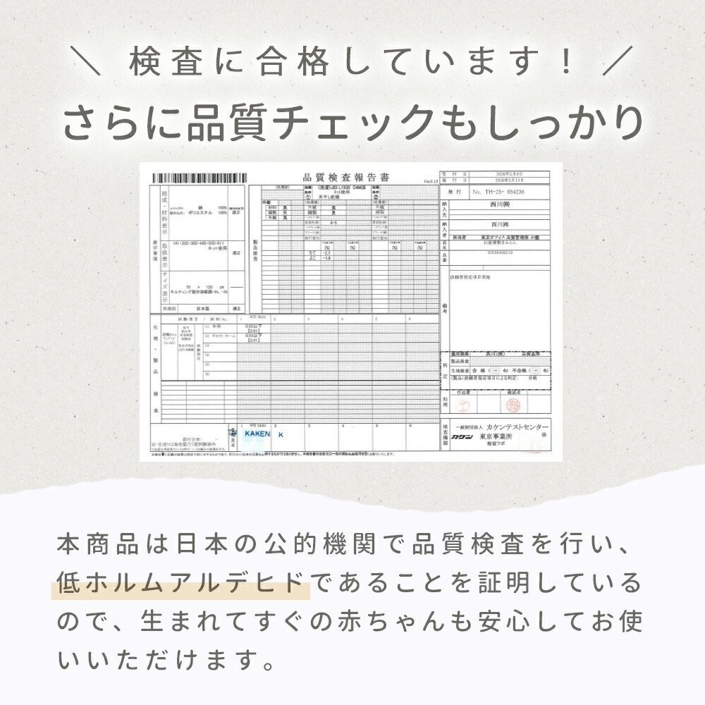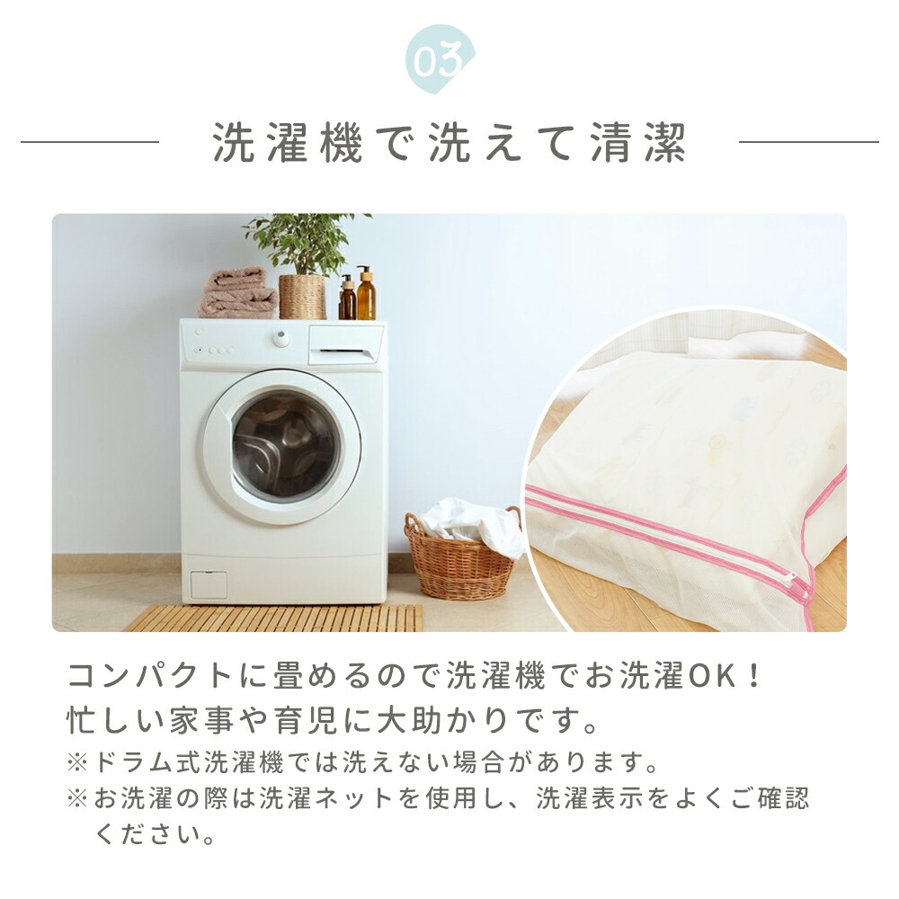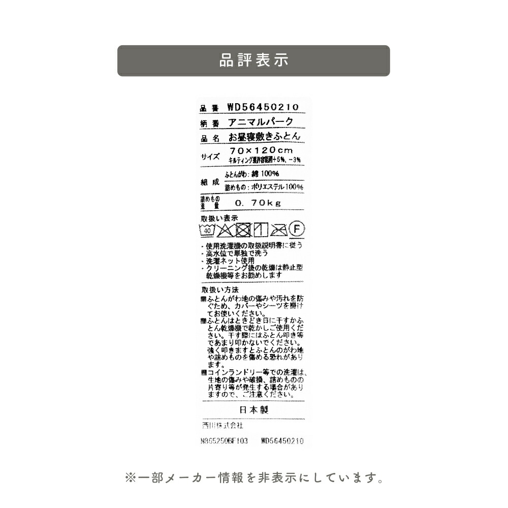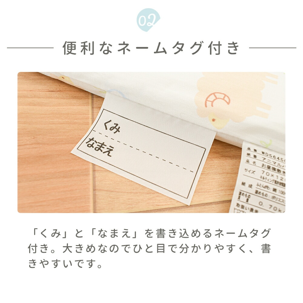 | ・固わた敷きふとん 中わたがおよそ700g入った敷き布団。厚みは約2?2.5cmと大人から見ると薄いですが、小さなお子さまのお昼寝用には十分な厚みです。その薄さと軽さからお子さま自身でも片付けやすい!※使い始めは折りにくいですが、二つ折りにも対応します。 ・便利なネームタグ付き「くみ」「なまえ」を書き込めるネームタグ付き。大きめなのでひと目で分かりやすく、書きやすいです。 ・洗濯機で洗えて清潔コンパクトに畳めるので洗濯機でお洗濯OK。忙しい家事や育児に大助かりです。※ドラム式洗濯機では洗えない場合があります。※お洗濯の際は洗濯ネットを使用し、洗濯表示をよくご確認ください。 ・信頼のクオリティ 西川の日本製西川株式会社は日本最大手の寝具メーカー。長年培った経験と技術に裏打ちされた品質で、赤ちゃんの肌に直接触れるものだからこそ安心してお使いいただけます。 ・無蛍光素材で安心・安全生地の白さを引き立てる蛍光塗料で染める工程を省きました。「白さ」ではなく、「生まれたばかりの赤ちゃんが安心して使える優しさ」を選びました。 ・検査に合格しています(品質チェックもしっかり)日本の公的機関で品質検査を行い、低ホルムアルデヒドであることを証明。生まれてすぐの赤ちゃんも安心してお使いいただけます。 | |