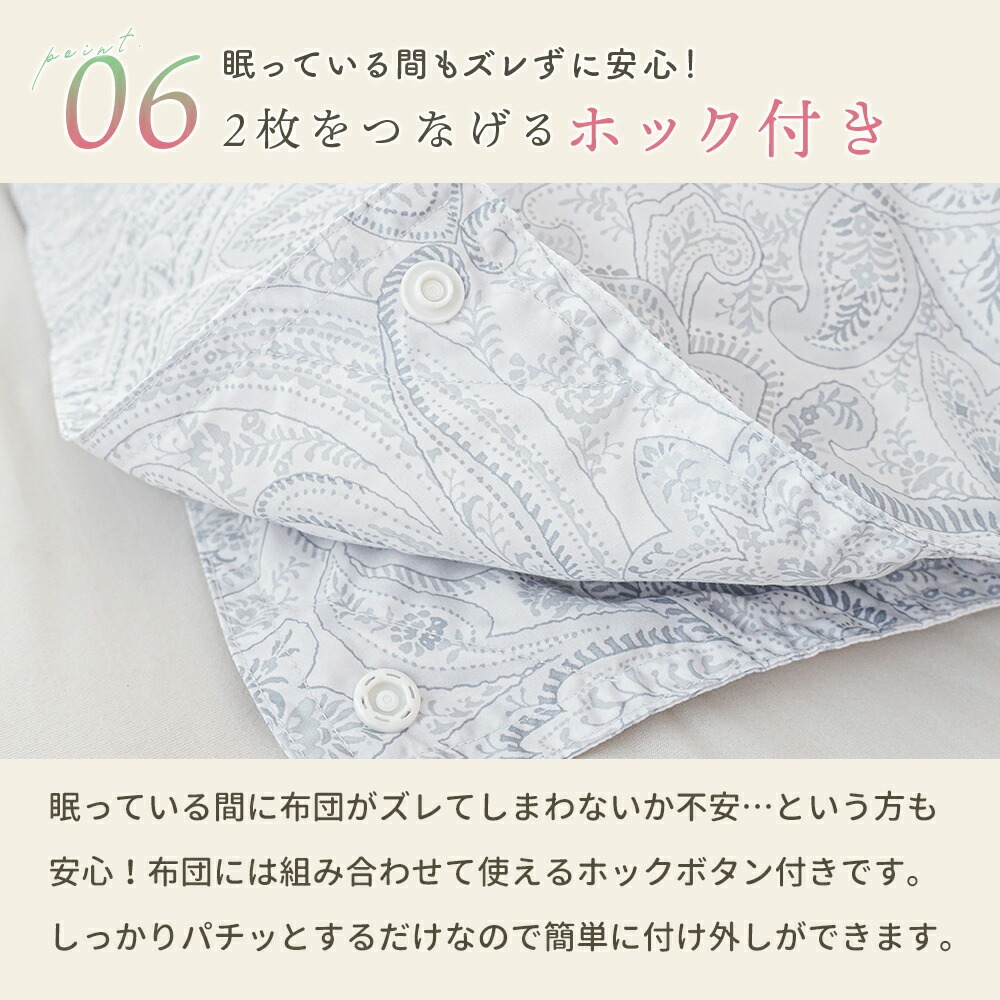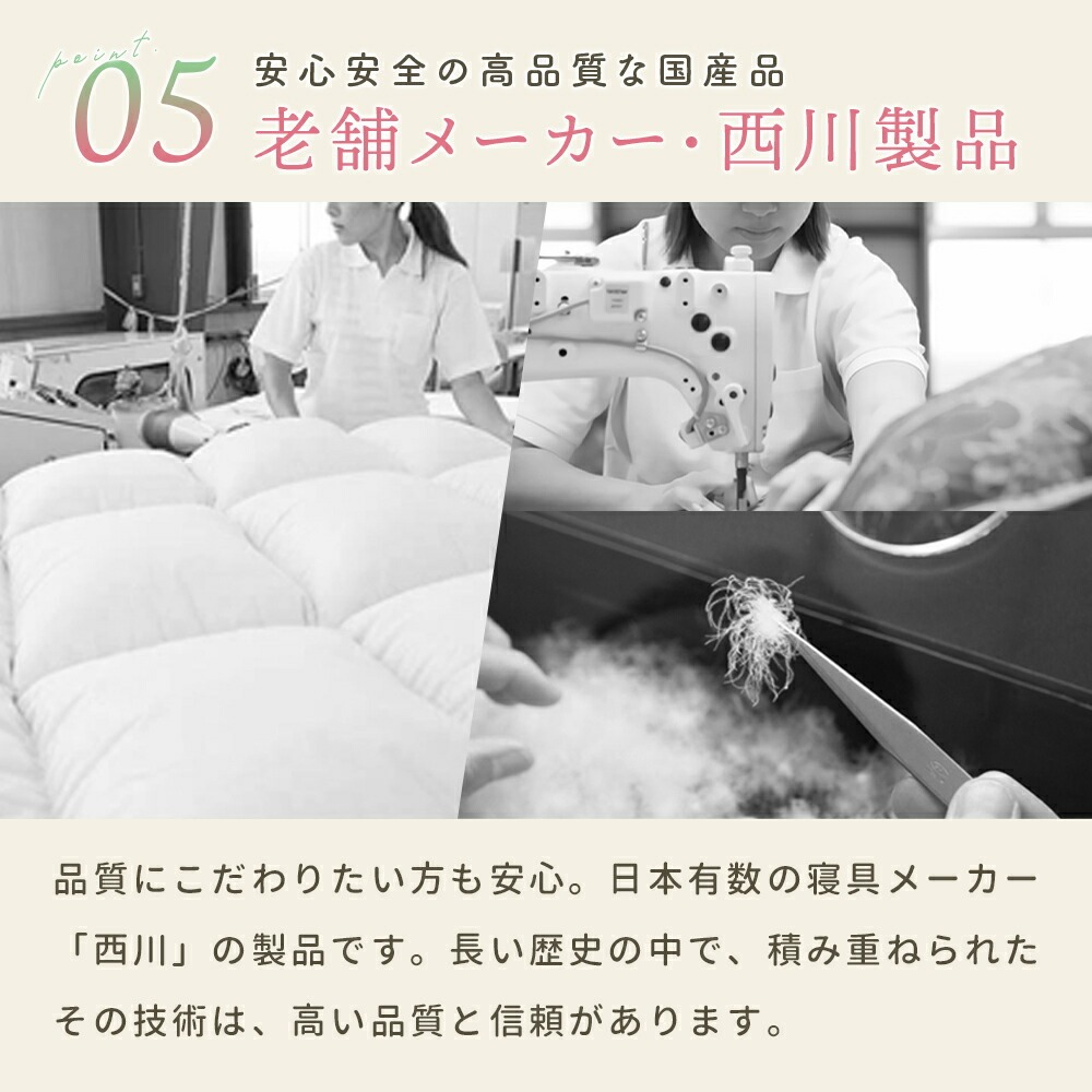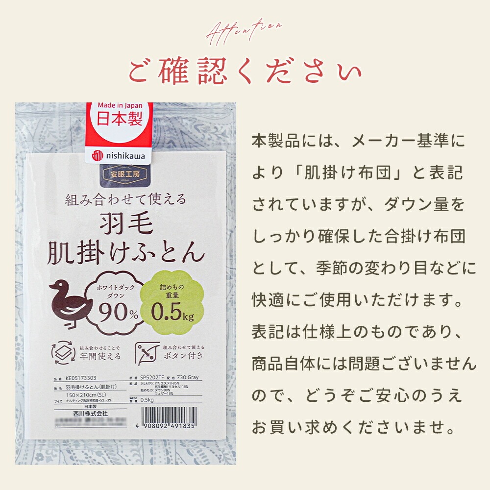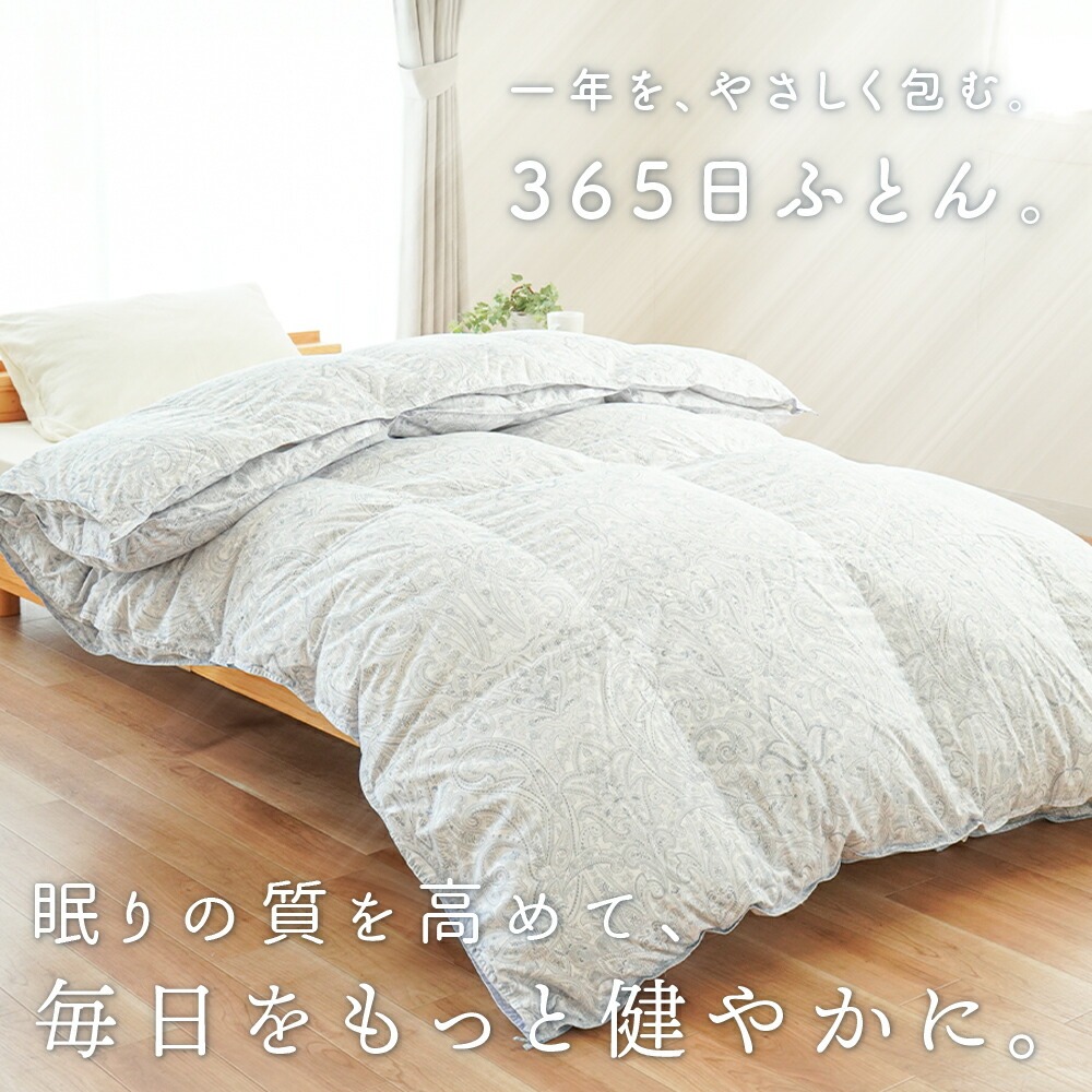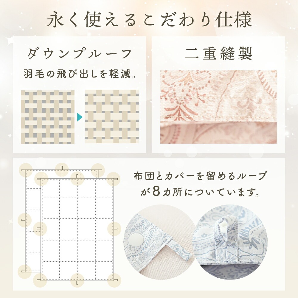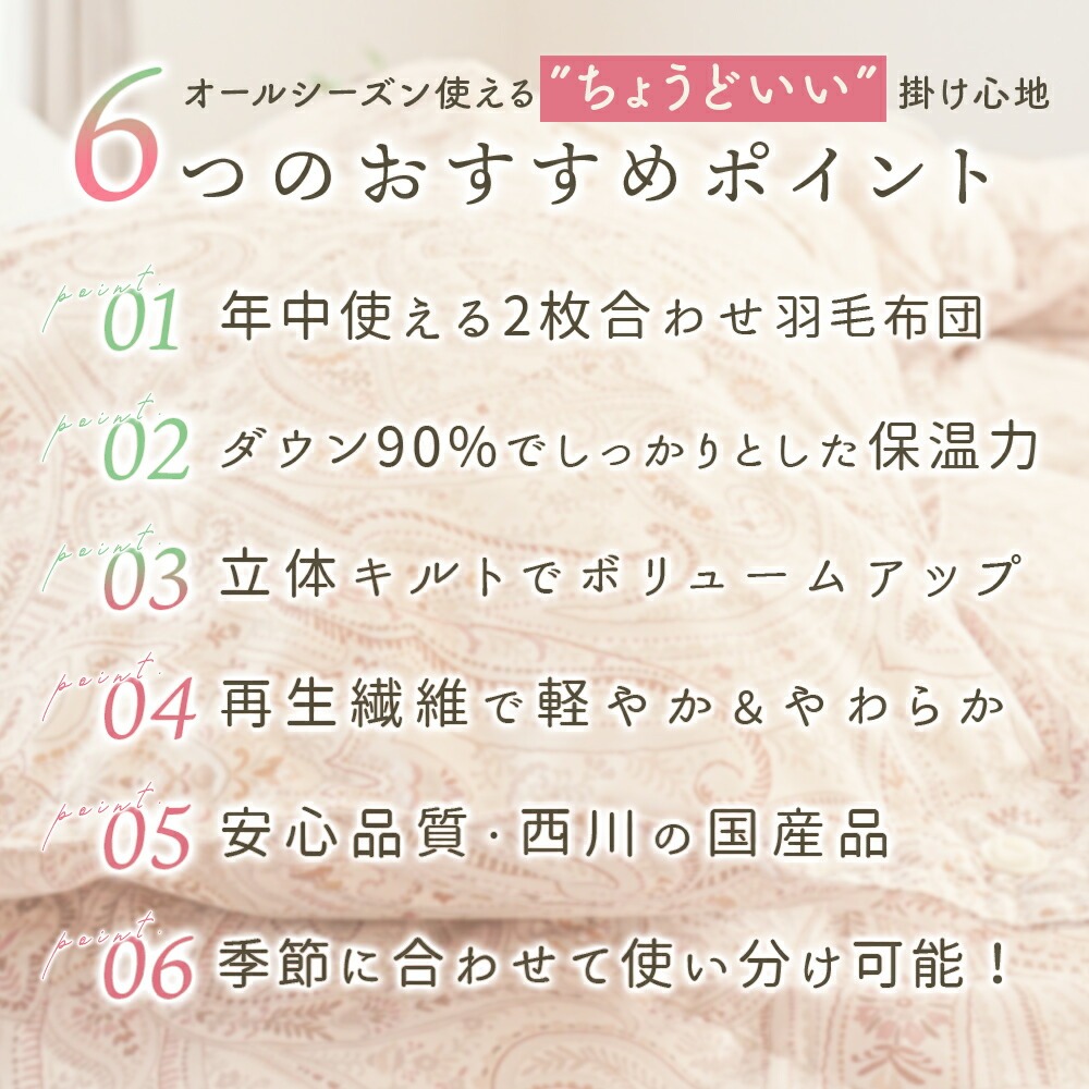 | ・掛け布団のお悩みともこれでさようなら!年中使えるちょうどいい羽毛布団 詰め物量が異なる合い掛け布団を重ねることで、冬も暖かく、季節に応じて使い分けすることができます。1年中快適に使える便利な布団で、掛け布団のお悩みも今日で解決! ・ダウン90%で詰め物量1.2kg。優れた保温力で暖かさをキープ厚みが異なる2枚を重ねて使うことで暖かな空気の層ができ、熱が逃げにくい2層構造に。羽毛量や品質が同じなので、厚手1枚よりも高い保温力で発揮します。 ・暖かさを逃がさない作り。立体キルトでボリュームアップ羽毛の持つふくらむ力を存分に発揮するため、羽毛の小部屋を立体的につくったキルトです。平面キルトの縫い目部分の無駄をなくし、暖かさを逃がしません。 ・環境に配慮した再生繊維生地。軽やか&柔らかさをプラス軽くて柔らかな再生繊維(リヨセル)に、丈夫なポリエステルを配合し、さらなる耐久性をプラスしました。優れた吸湿性と通気性を兼ね備えました。 ・安心安全の高品質な国内品、老舗メーカー・西川製品品汁にこだわりたい方も安心。日本有数の寝具メーカー「西川」の製品です。長い歴史の中で、積み重ねられたその技術は、高い品質と信頼があります。 ・眠っている間もズレずに安心!2枚をつなげるホック付き眠っている間に布団がズレてしまわないか不安…という方も安心!布団には組み合わせて使えるホックボタン付きです。しっかりパチッとするだけなので簡単に付け外しができます。 ・シーンや季節に合わせて快適に、選べる3パターンの使い分け合い掛け布団の2枚合わせで、3通りの使い方が可能。季節の移り変わりやお部屋の環境に合わせて、1年中快適にお使いいただける便利なお布団です。 | |