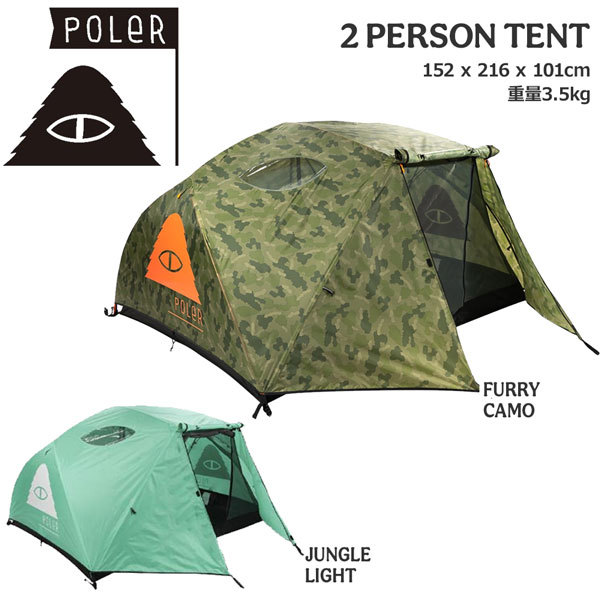大人気のPOLERテントに新色登場。持ち運びやすい超軽量なデザインで、簡単に組み立てられる2人用テント。ポールを伸ばしてインナーのメッシュテントをかけ、その上からカバーテントを被せるだけで設置が可能。