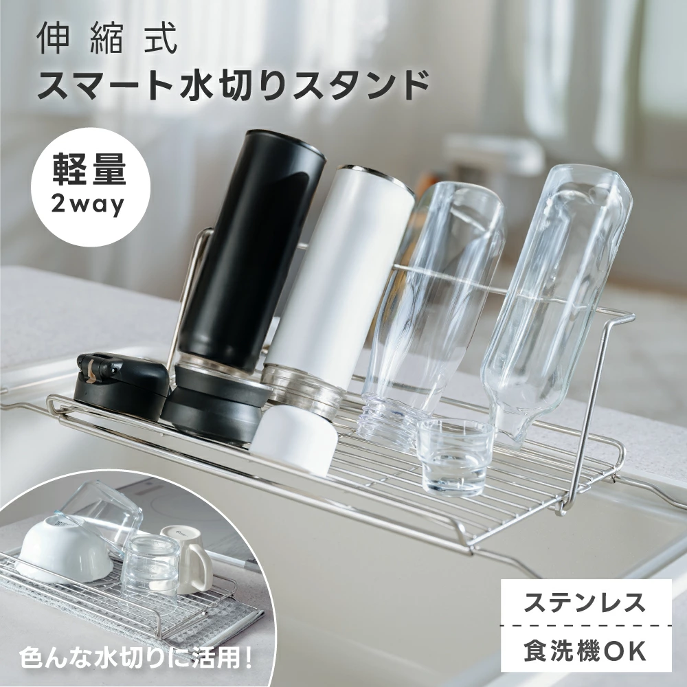 水切りラック 折りたたみ 伸縮 ステンレス シンク上 水切りかご 水筒スタンド 大容量 横置 棚 おしゃれ 収納 お皿も 水筒も キッチンラック 調理台 省スペース