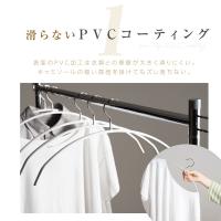 【滑らないPVC加工/洗濯ハンガーに使える】素材は丈夫なスチール製フレーム。表面はPVCコーティングを施し、衣類との摩擦が大きいため、カーディガン、キャミソールなどの細い肩紐を掛けても滑らず、クローゼットの中で落ちる心配もありません。また、PVCは錆に強いので、洗濯物を干して乾いたらそのまま収納もできます。