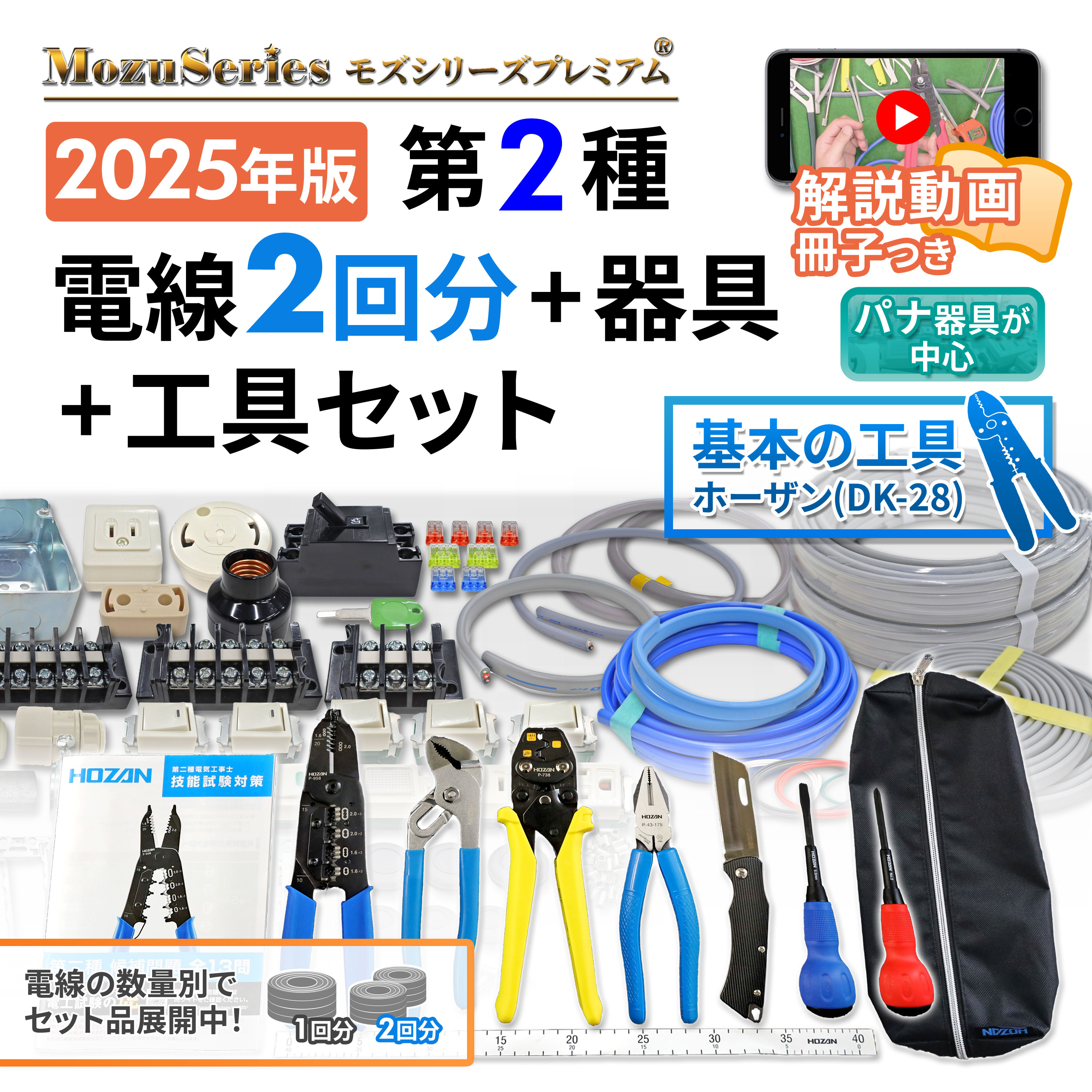 電気工事士 2種 実技 工具 工具セット と 技能試験セット 1式 電線2回分と器具セット 2025年 ホーザン 工具付き モズシリーズ