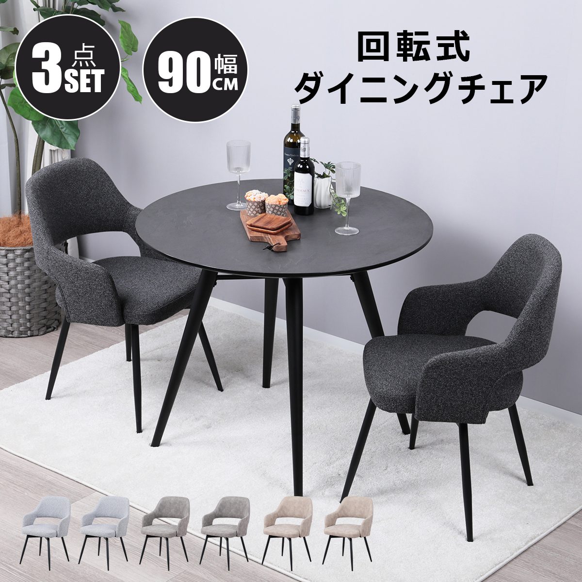 ダイニングテーブルセット 2人 3点セット 丸 90cm幅 メラミン天板 円形 ダイニングチェア 回転式 2脚セット 肘付き 360°回転椅子 北欧 おしゃれ 食卓 一枚板