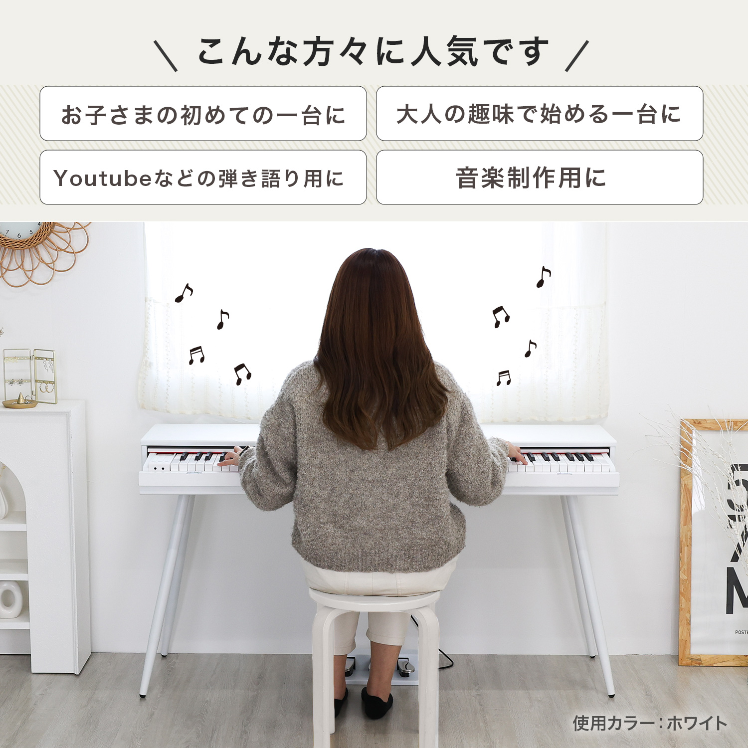 ■本物のピアノと同じ88鍵盤。タッチ感知機能搭載で、弾く強さによって音の強弱をつけられるので表現の幅がさらに広がります。