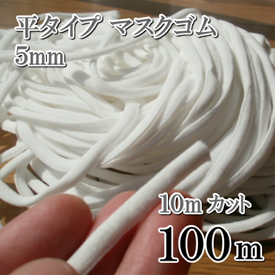 100m 5mm マスク用ゴム紐 10m×10本 マスクゴム 平 耳が痛くなりにくい ハンドメイド 5ミリ ゴム ひも 手芸 やわらかい ソフト 白 4mm 〜 5mm ホワイト