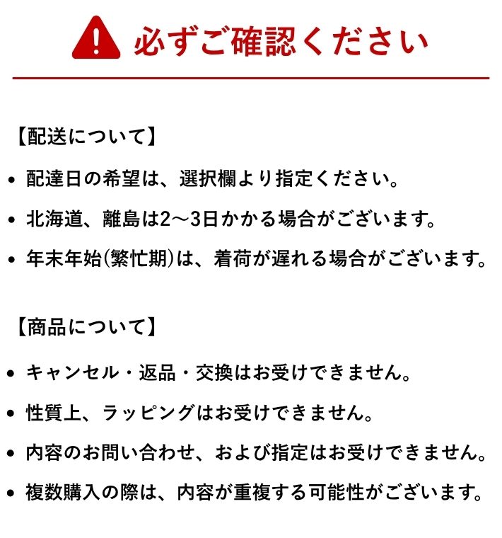 | 【配送について】 ・配達日の希望は、選択欄より指定ください。 ・北海道、離島は2〜3日かかる場合がございます。 ・年末年始(繁忙期)は、着荷が遅れる場合がございます。 【商品について】 ・キャンセル・返品・交換はお受けできません。 ・性質上、ラッピングはお受けできません。 ・内容のお問い合わせ、および指定はお受けできません。 ・複数購入の際は、内容が重複する可能性がございます。 |