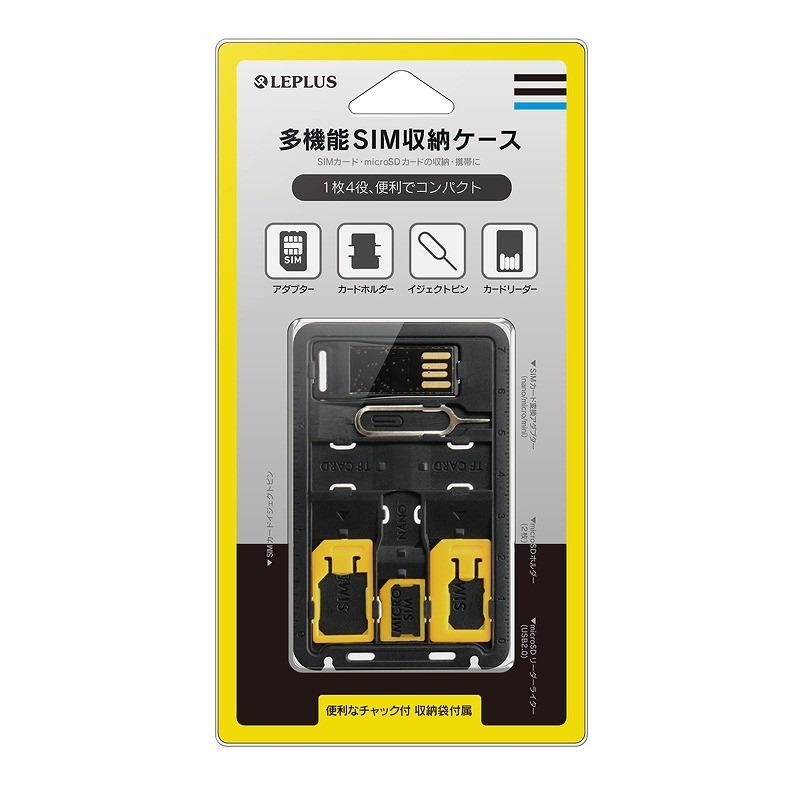 SIMカードの大きさを調整できる変換アダプター、microSDをそのままUSBメモリーとして使えるリーダーライター付き。