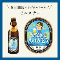 父の日のギフト、お父さんの誕生日プレゼントに最適です。「お父さま ありがとう」「感謝を注ぐ」の文字と絵の入った父の日オリジナルラベルのビールです。お父さんに日ごろの感謝の気持ちを込めてお送りください。