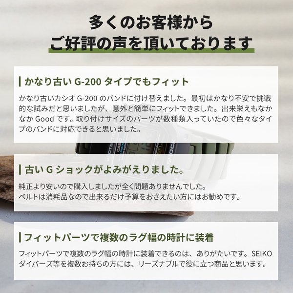 G-SHOCK等へ合わせても時計ベルト幅が23.5mmの為、時計本体だけが浮かず装着可能。