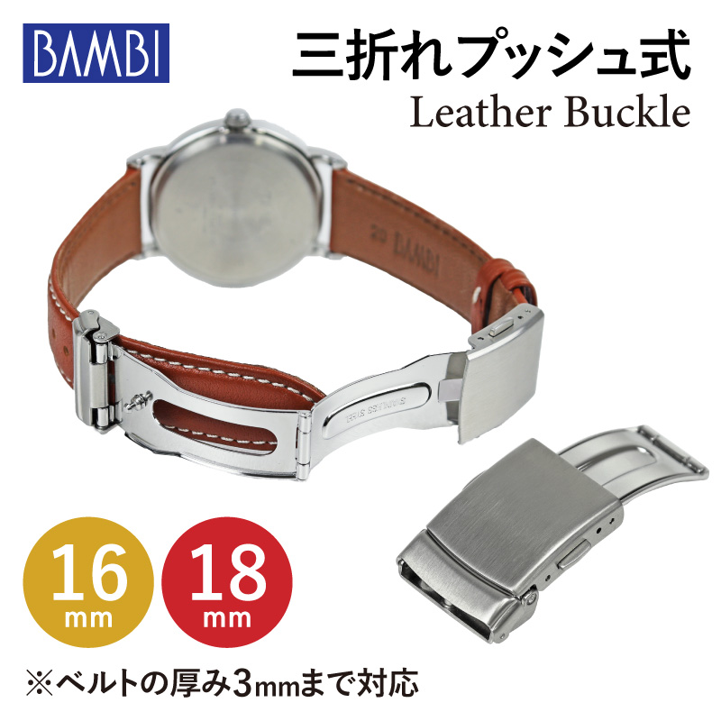 Dバックル 腕時計ベルト 時計ベルト 時計 ベルト 時計バンド 時計 バンド バンビ レザーベルト用 プッシュ式三つ折れ シルバー ZS002 16mm 18mm