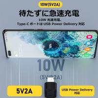 10W(5V2A)の高速充電。Type-CポートはUSB Power Deliveryに対応し、ノートPCやスマートフォン、大容量モバイルバッテリーなど様々なデバイスを素早く充電します。