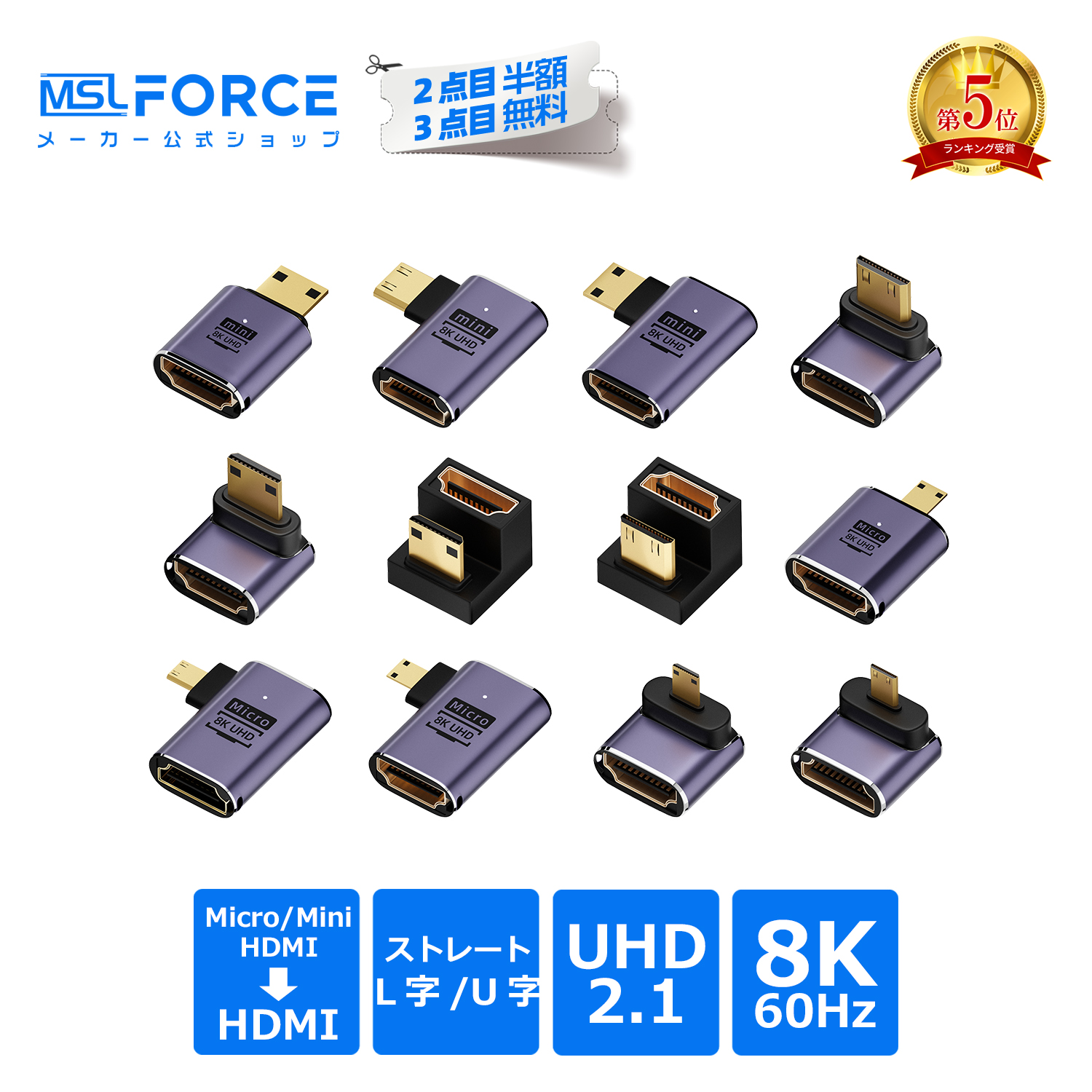 Micro HDMIオスまたはMini HDMIオス to HDMIメス変換アダプタです。小型でスペースが限られている場所でも接続しやすく、8K@60Hz/4K@120Hzに対応し、高画質・高音質な映像を提供します。