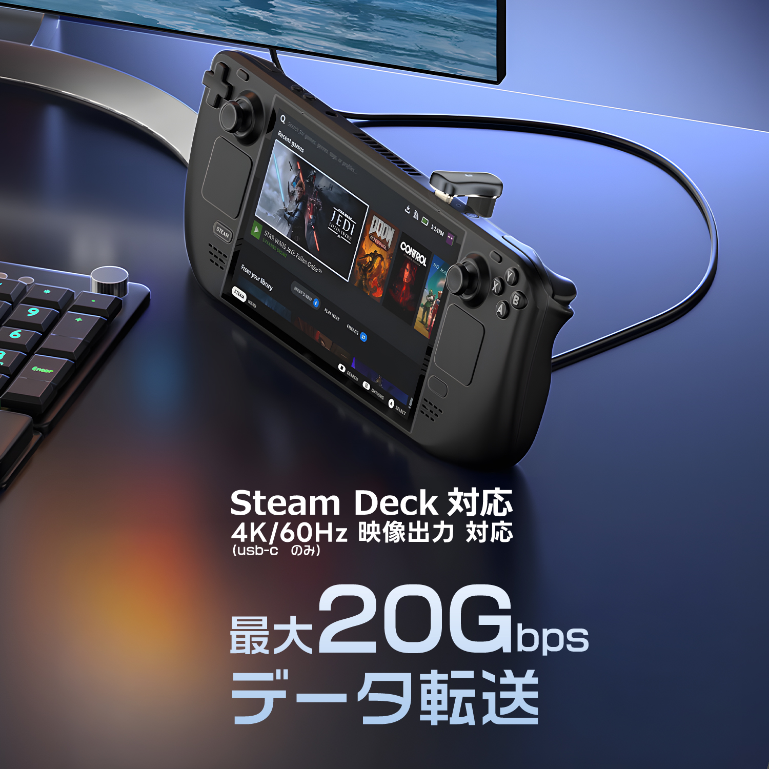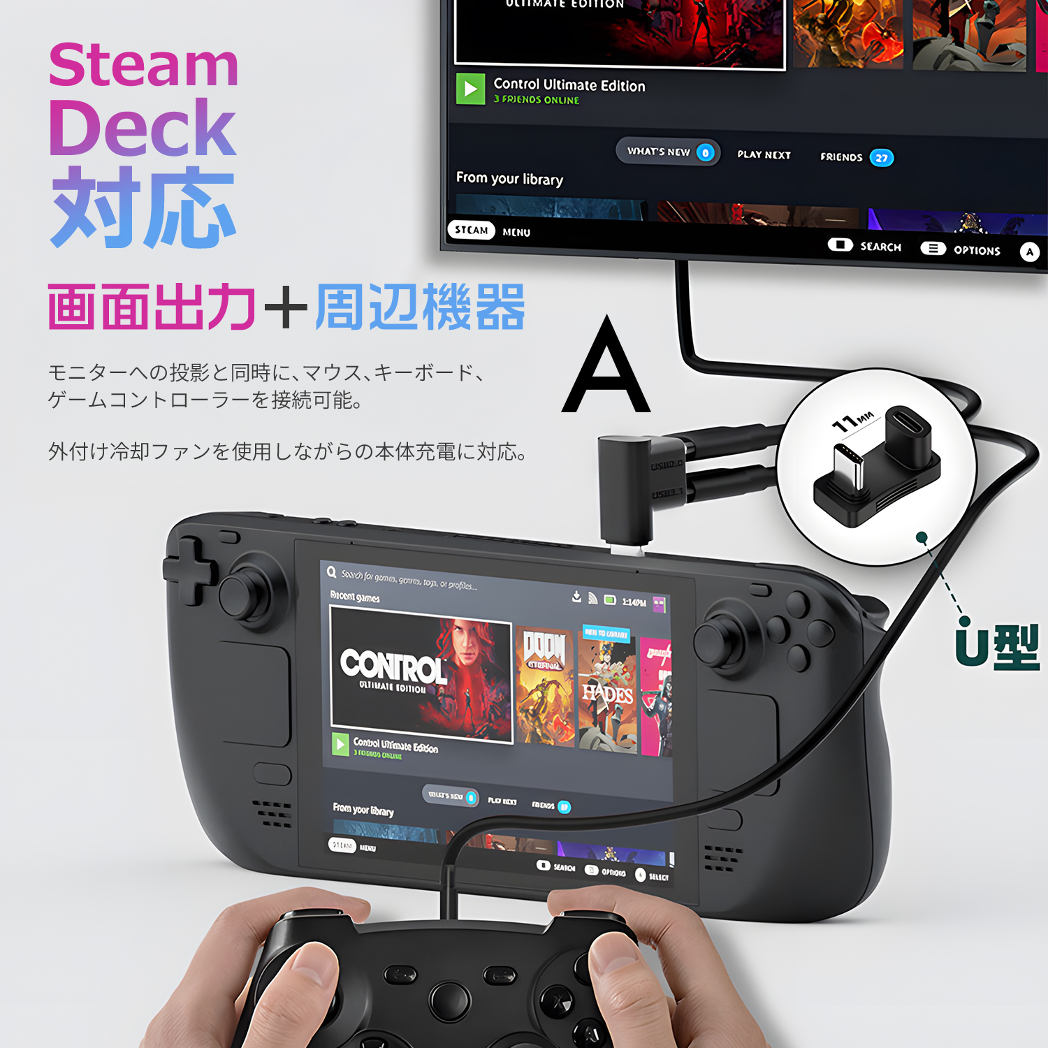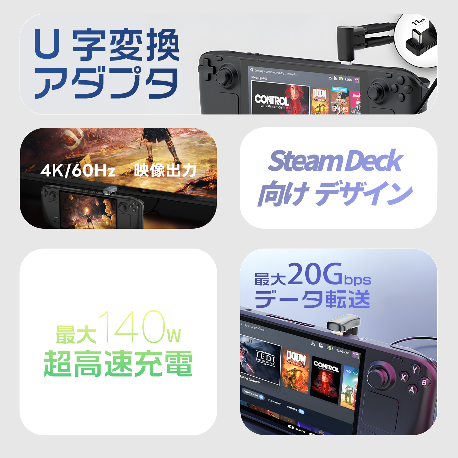 U字型構造でケーブルの折れ曲がりを防止し、耐久性・操作性をアップ。正反どちらからでも簡単に抜き差し可能で、180°弯頭設計により持ち運びにも便利。Steam Deck専用設計で、より快適なゲーム体験をサポートします。