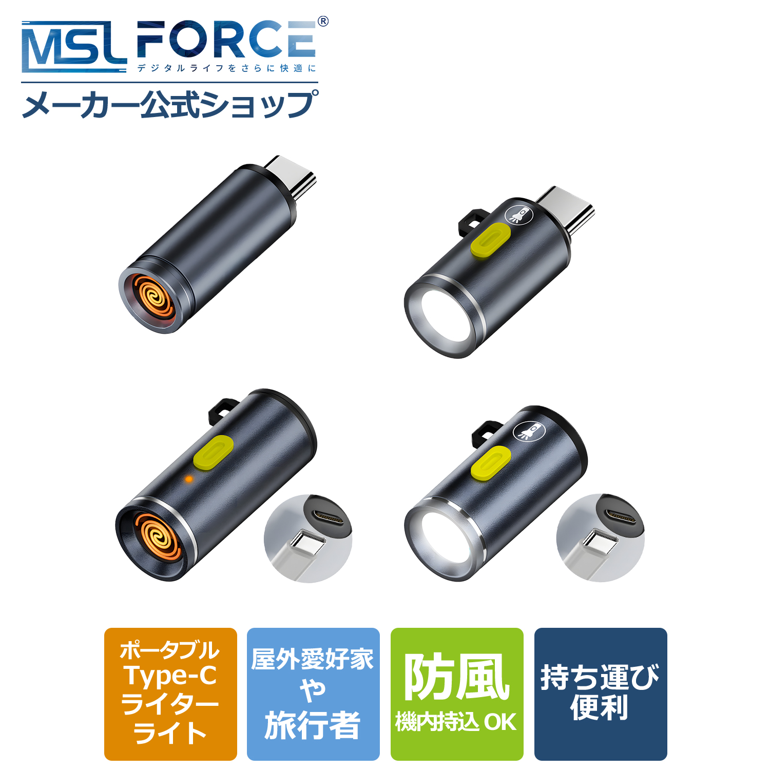 アウトドア、キャンプ、登山、旅行など幅広いシーンで活躍します。従来のライターのように燃料補充が不要で、Type-Cポートに差し込むだけで使用可能。火を使わずに加熱コイルで点火するため、安全性が高く、屋内外で安心して使用できます。